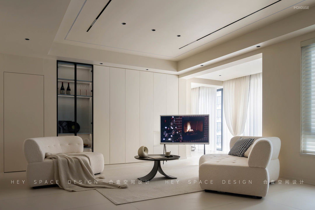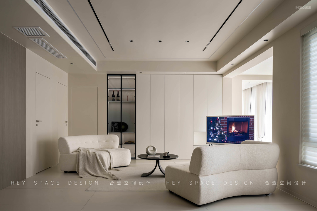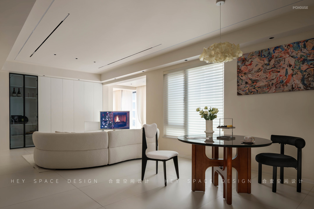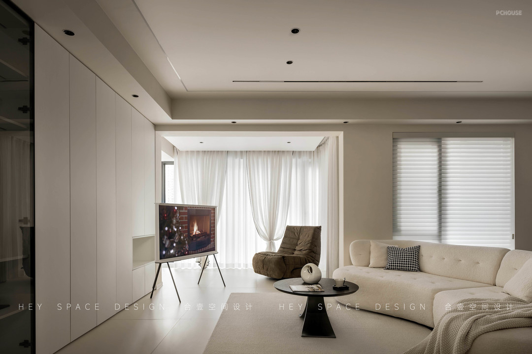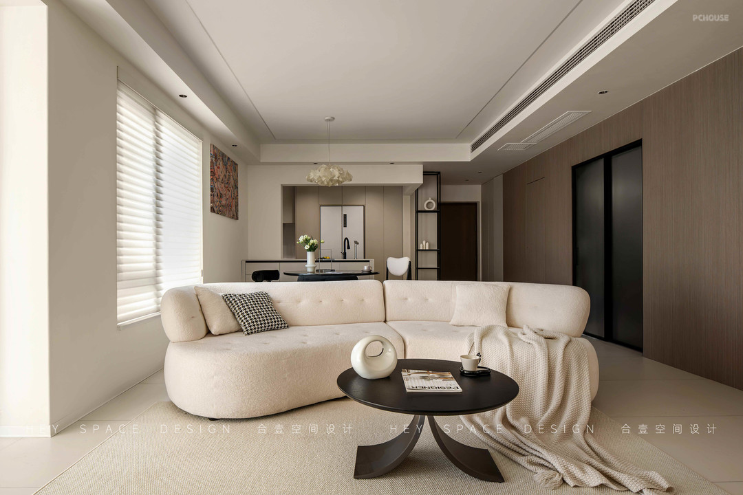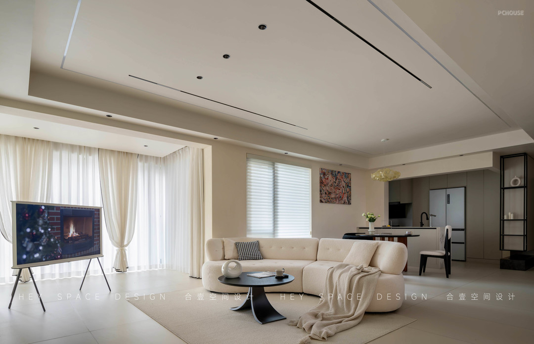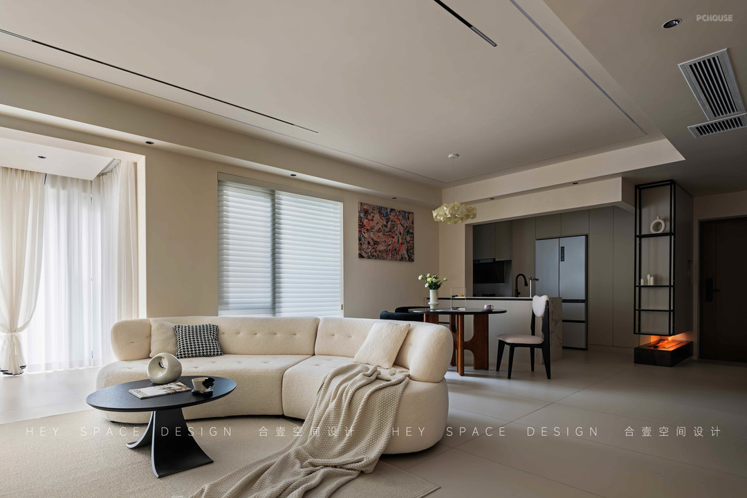 @合壹空间设计:客厅以奶油暖色为主,墙面简洁,地面铺同色瓷砖,整体开阔通透。米白色沙发圆润柔软,搭配毛毯和黑白格纹抱枕,舒适又有格调。黑色不规则茶几上,摆件与杂志尽显生活气息。电视用可移动支架,整面按压式电视柜集收纳和隐形门于一体,视觉极简干净。窗户配百叶窗和纱帘,阳光入室,氛围温暖。