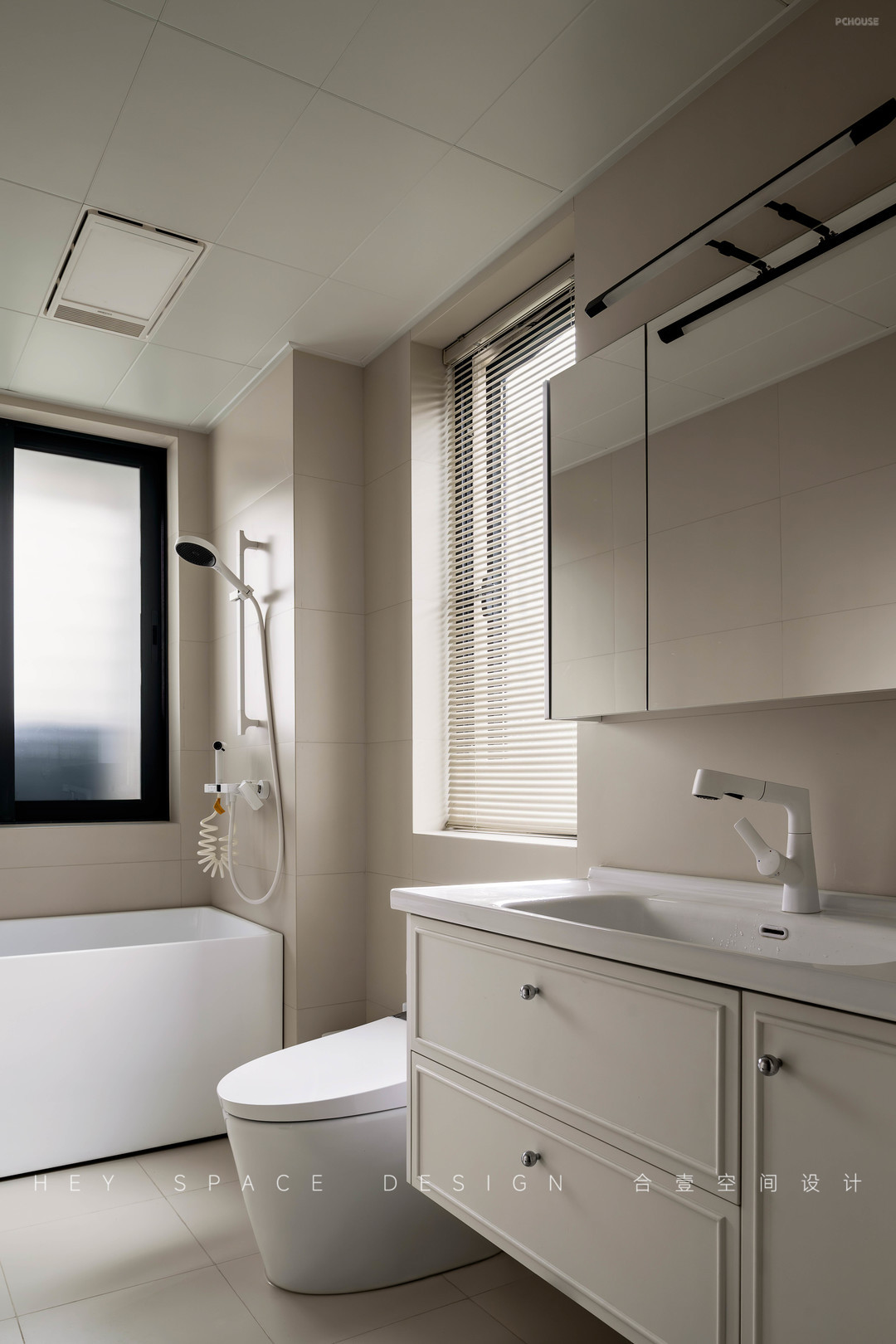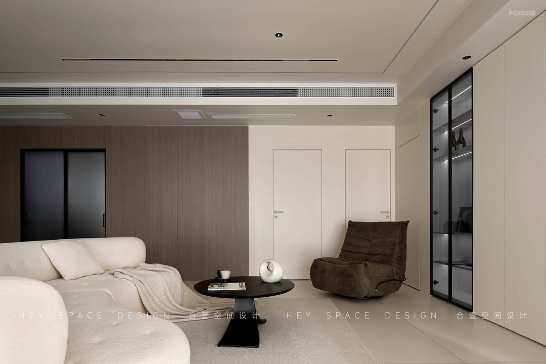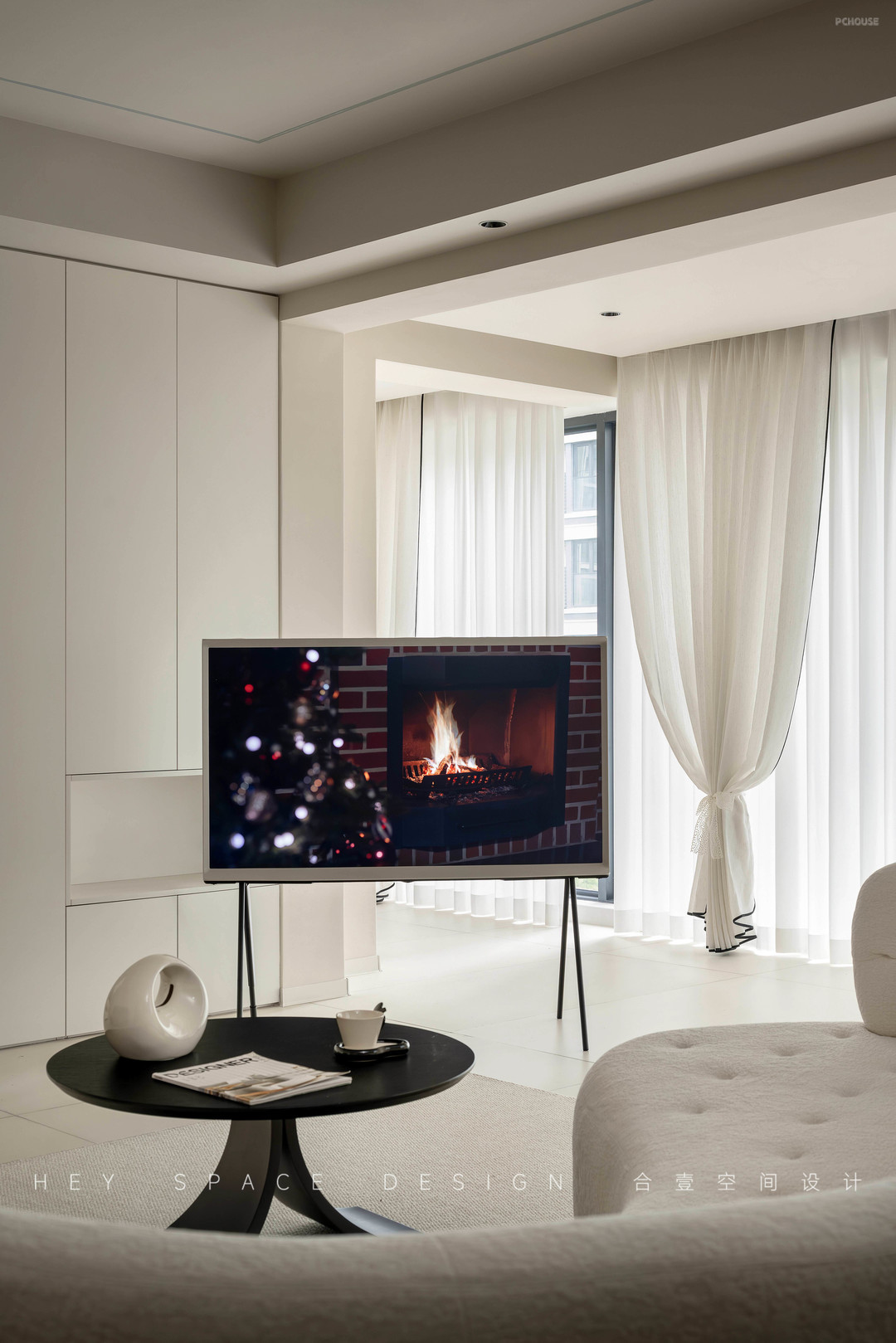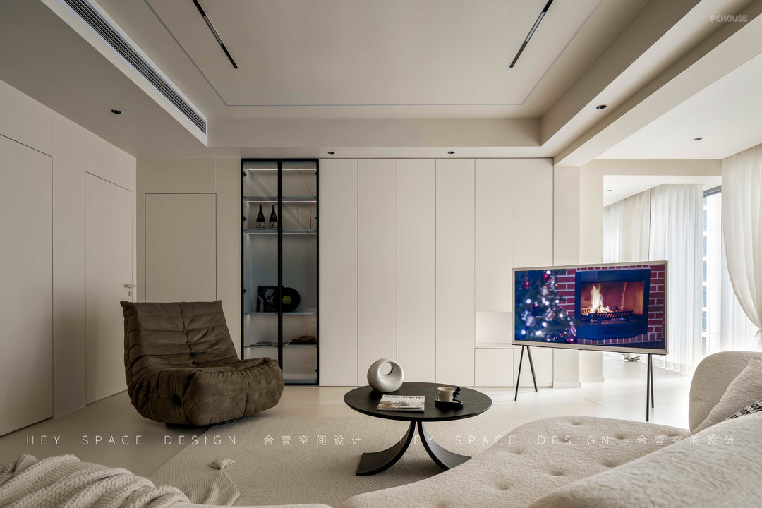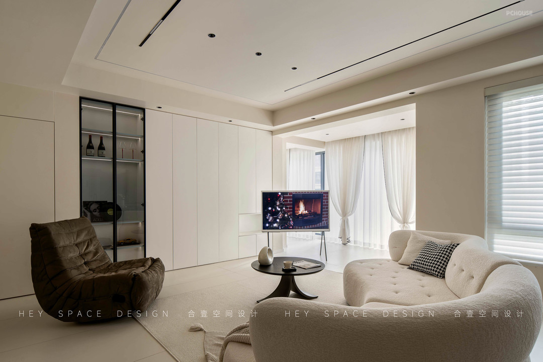 @合壹空间设计:客厅以奶油暖色为主,墙面简洁,地面铺同色瓷砖,整体开阔通透。米白色沙发圆润柔软,搭配毛毯和黑白格纹抱枕,舒适又有格调。黑色不规则茶几上,摆件与杂志尽显生活气息。电视用可移动支架,整面按压式电视柜集收纳和隐形门于一体,视觉极简干净。窗户配百叶窗和纱帘,阳光入室,氛围温暖。