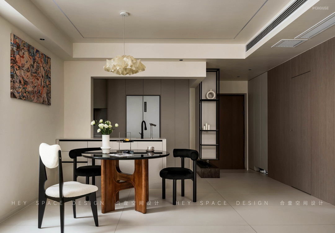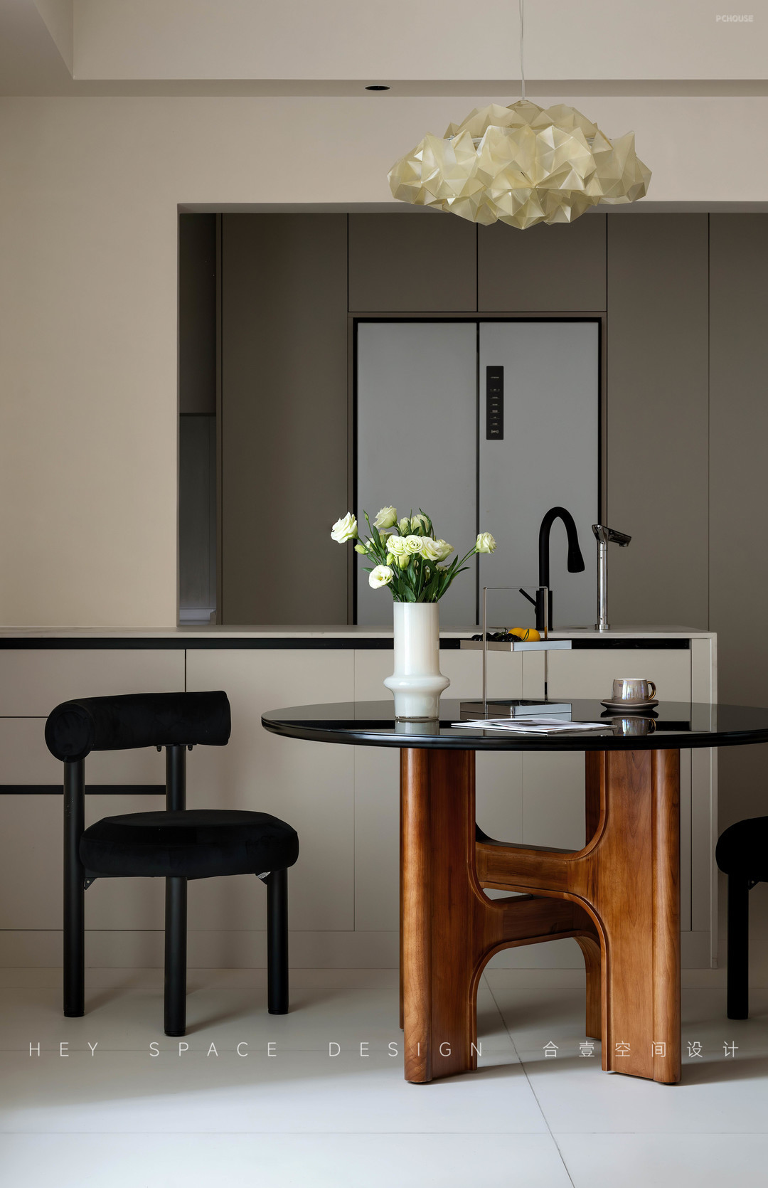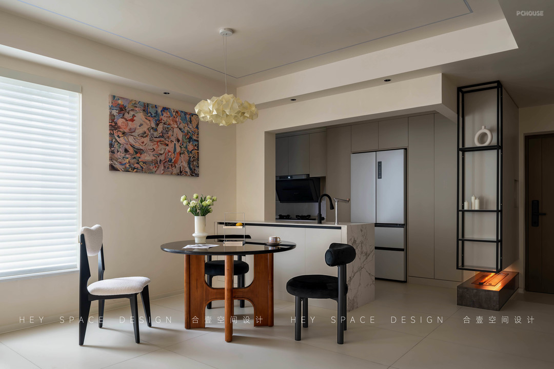 @合壹空间设计:餐厅,是家人朋友共享美食、交流情感的温馨空间,极简风格让这份温馨更显纯粹。开放式的布局是其常见特点,与相邻空间自然衔接,使视野开阔通透。餐桌的选择注重简约与质感,餐桌,纹理自然,造型简洁大方,成为餐厅的视觉焦点。搭配的餐椅同样线条流畅,简约中透着舒适。餐桌上方的吊灯造型独特,灯光柔和,为用餐时刻增添了浪漫氛围。餐厅背景墙挂着一幅简约的艺术画,既丰富了空间层次,又保持了整体的简洁感。在这里,人们可以抛开外界的纷扰,专注于美食与彼此的陪伴,享受欢聚的美好时光。