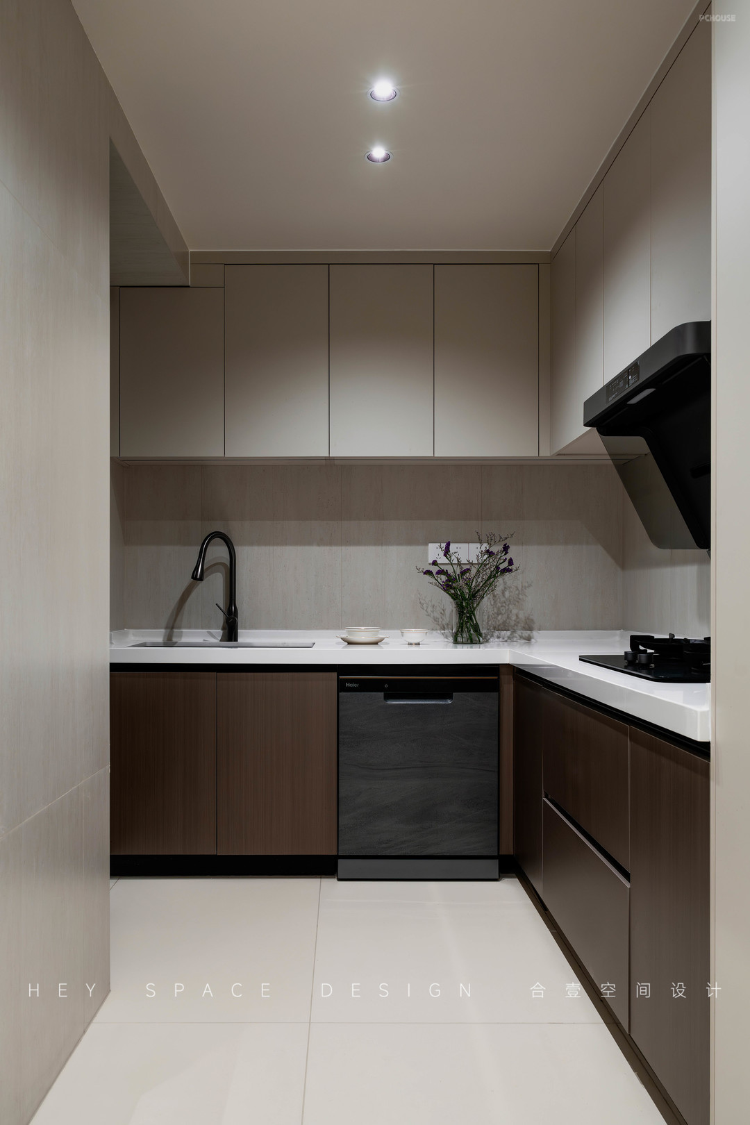 @合壹空间设计:厨房,将功能性与美观性完美融合,打造出高效、整洁的烹饪环境。采用U型的格局分化成L型橱柜操作台+西厨水吧台,让操作动线流畅,烹饪过程更加便捷高效。橱柜设计简洁大方,无把手的柜门设计让外观整洁统一,同时也避免了磕碰的麻烦。厨房以中性色调为主,如白色、灰色、木色等,营造出干净清爽的视觉效果。台面宽敞平整,易于清洁,各种厨房电器巧妙地采用嵌入式设计,与橱柜融为一体,节省空间的同时保持了整体的美观。