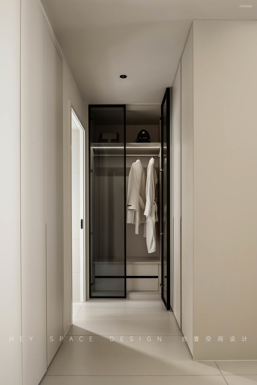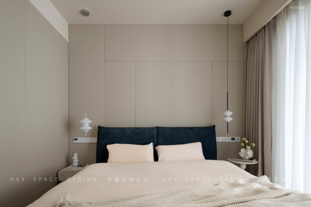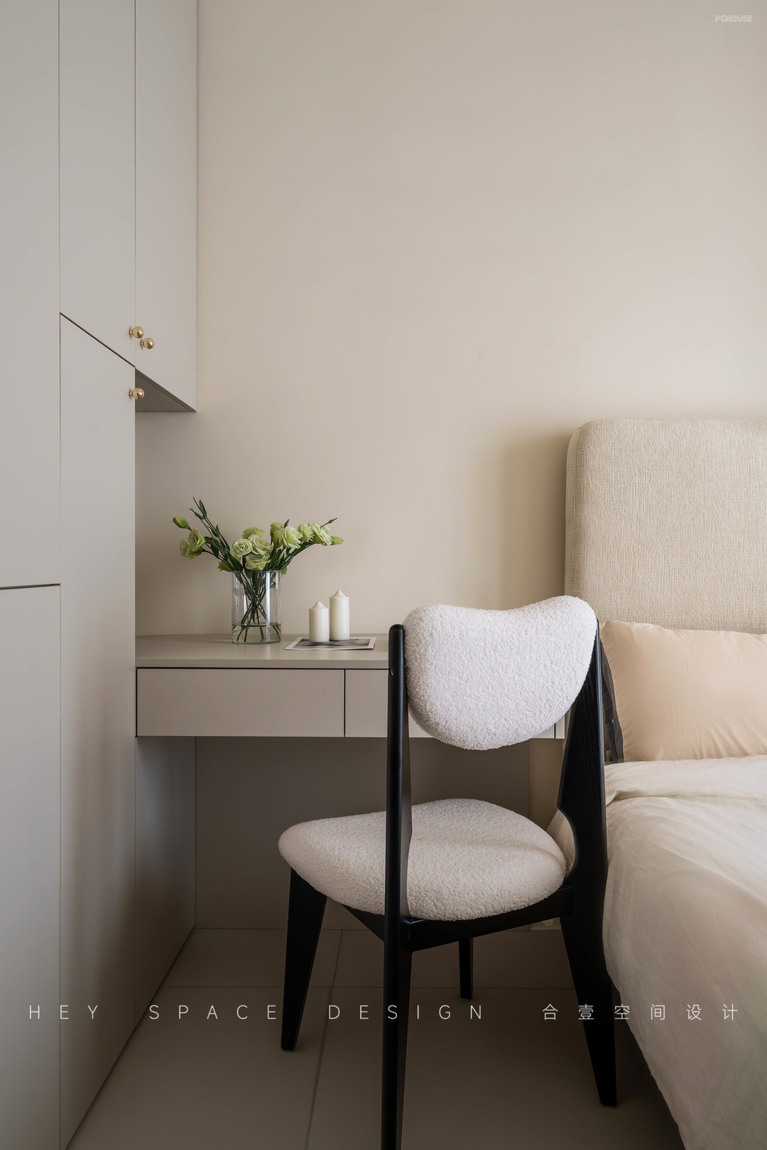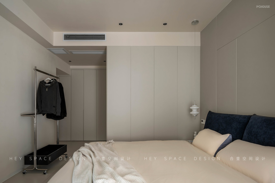 @合壹空间设计:卧室,作为每日养精蓄锐的私密空间,极简风格赋予它宁静与温馨的独特气质。步入其中,定制的U型衣柜巧妙的分隔开衣帽间和睡眠区。U型让男女主人更好的分区收纳,睡眠区仅用柔和的色彩渲染出温暖氛围。墙面搭配利落的线条,营造出平和舒缓之感。床尾置放女主人的梳妆台和衣帽架。兼顾空间的利用和实用性。床头的吊灯造型别致,在提供柔和照明的同时,增添了空间的精致感。