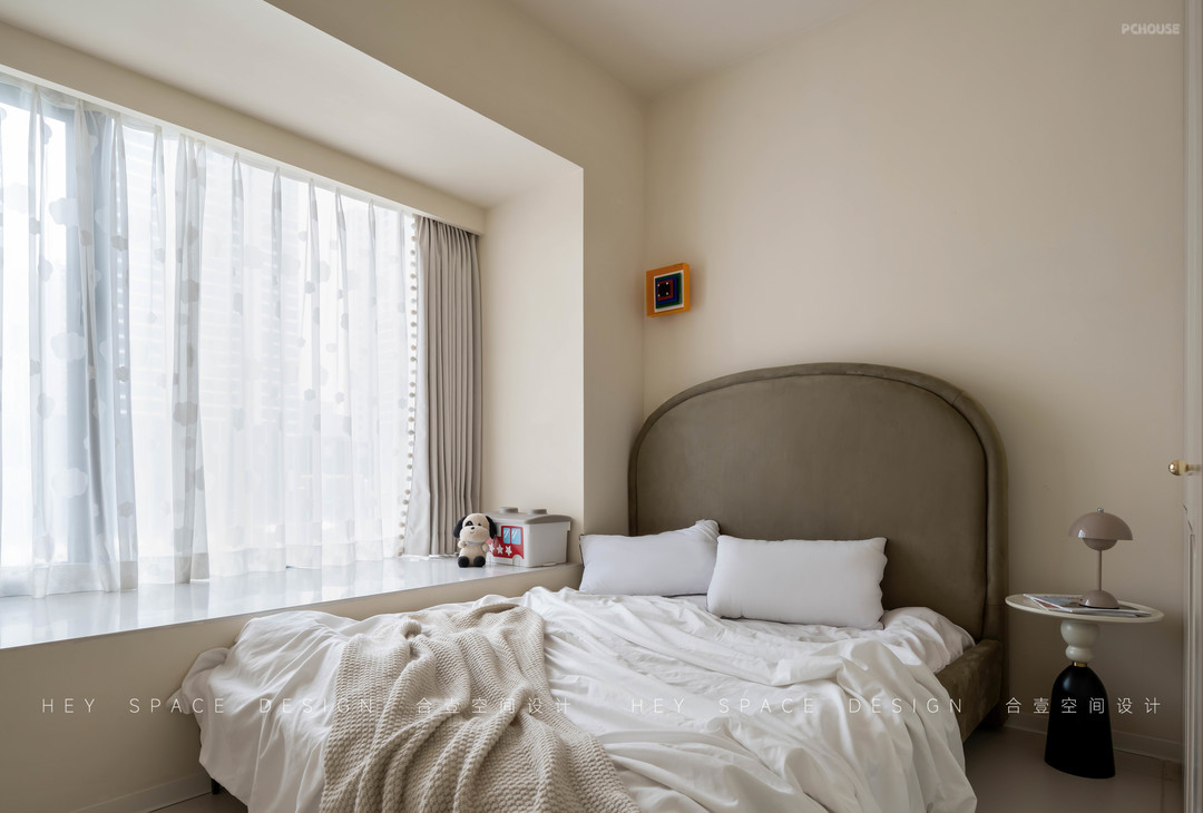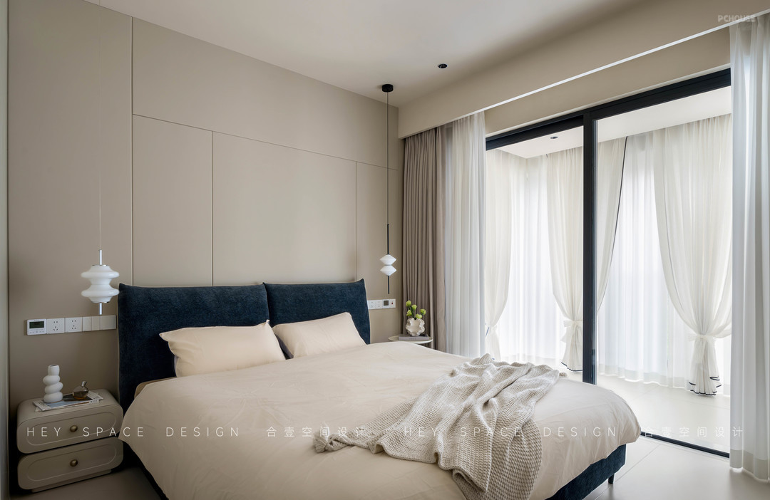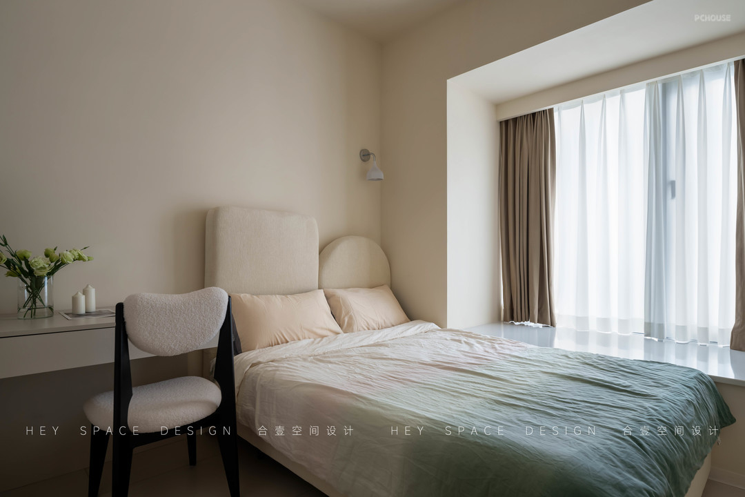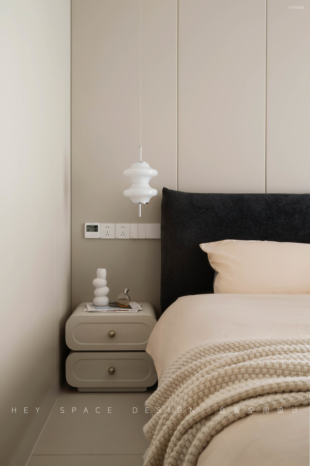 @合壹空间设计:卧室,作为每日养精蓄锐的私密空间,极简风格赋予它宁静与温馨的独特气质。步入其中,定制的U型衣柜巧妙的分隔开衣帽间和睡眠区。U型让男女主人更好的分区收纳,睡眠区仅用柔和的色彩渲染出温暖氛围。墙面搭配利落的线条,营造出平和舒缓之感。床尾置放女主人的梳妆台和衣帽架。兼顾空间的利用和实用性。床头的吊灯造型别致,在提供柔和照明的同时,增添了空间的精致感。