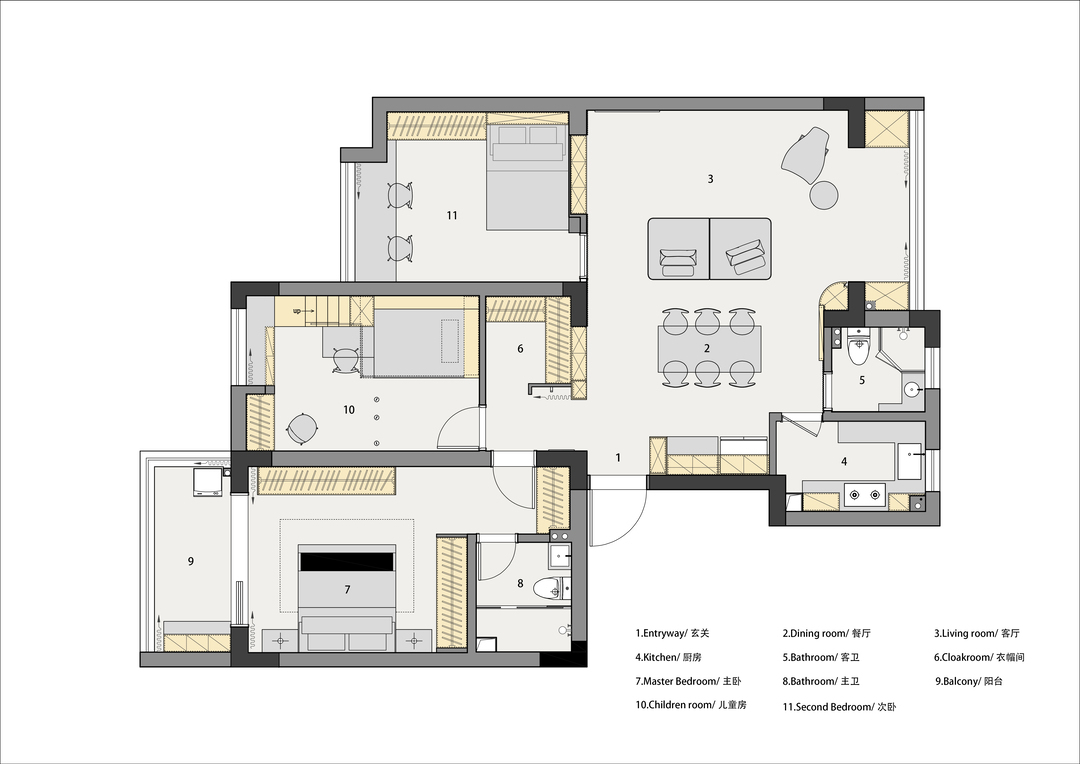 4.对次卧飘窗、客厅、餐厅、儿童房的墙体进行了利用。