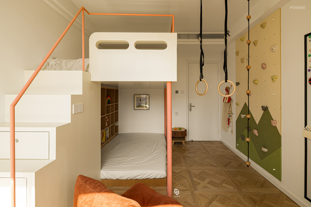 3.儿童房上下床设计满足两个小孩的玩耍、休息、学习,增添趣味。