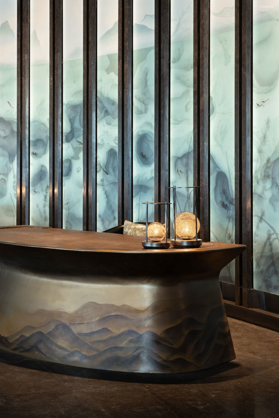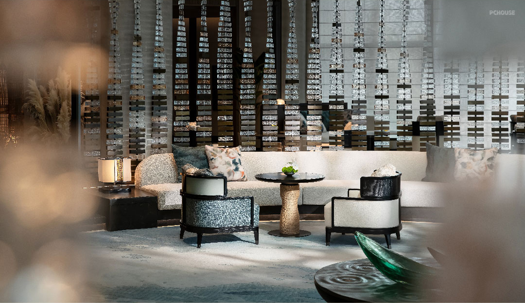 通透玻璃砖与相城十绝中的御窑金砖,似长词短句,裁缀雅致帘幕,予人庇护并营造若隐若现的朦胧意韵。青绿水墨晕染总台屏风、天花上鱼戏图动态投影、湖蓝家具与地毯,处处氤氲着江南诗意。