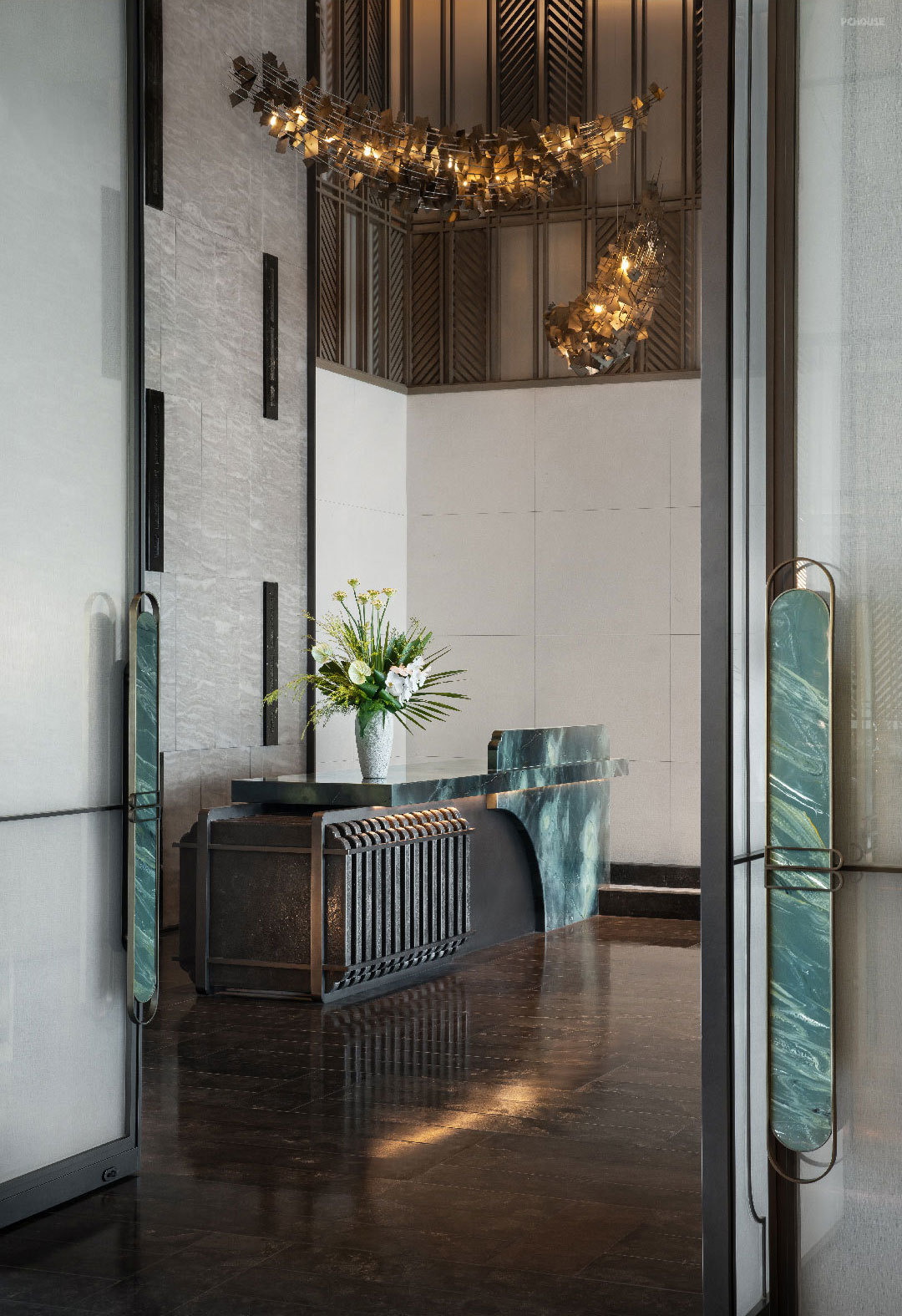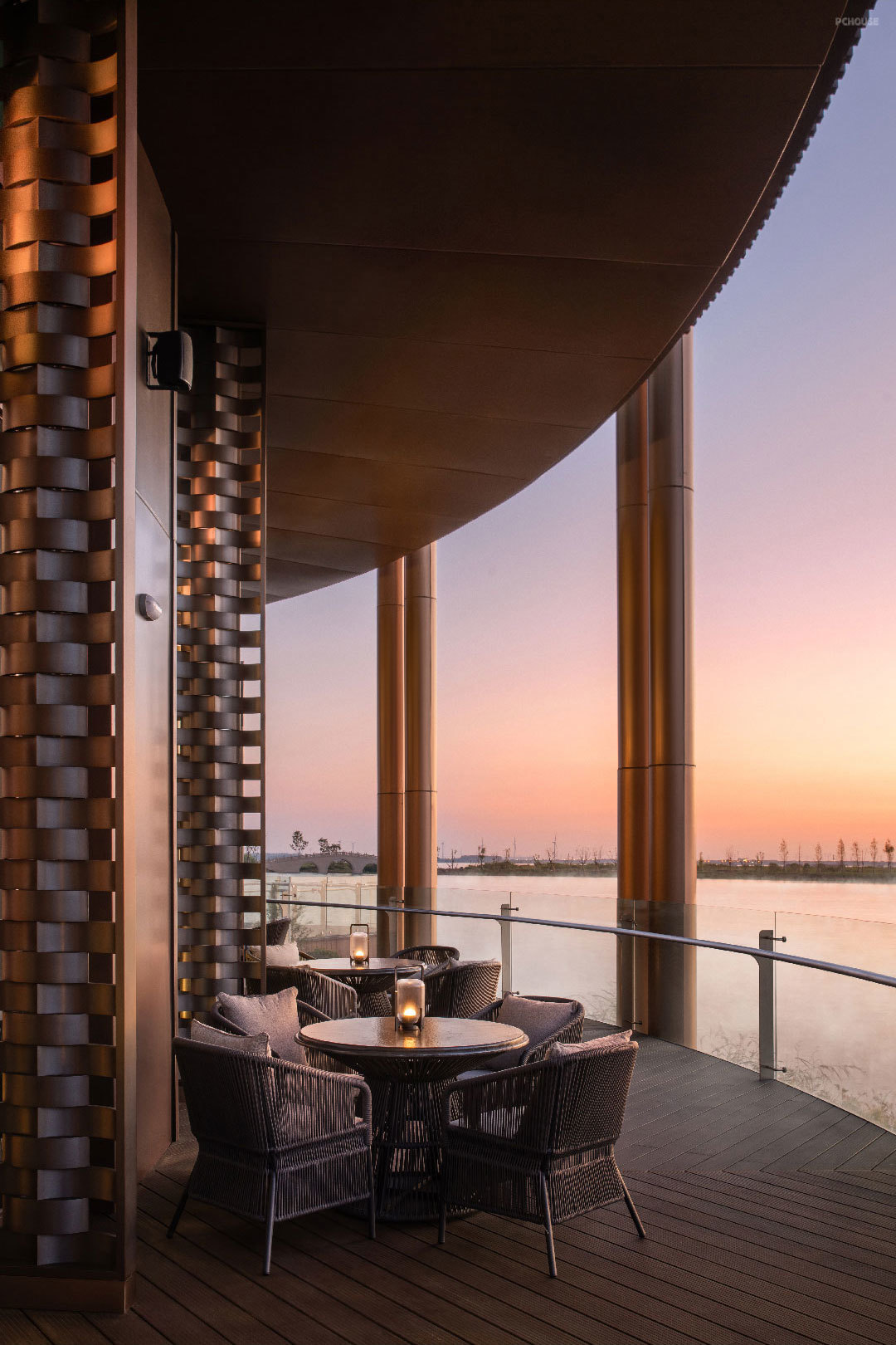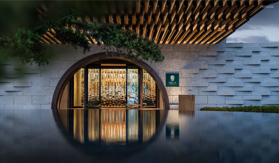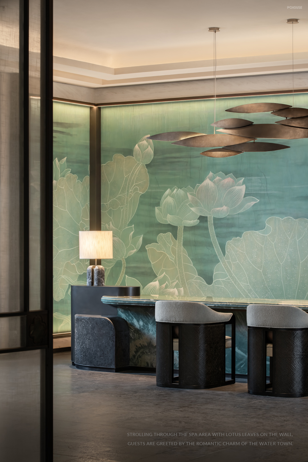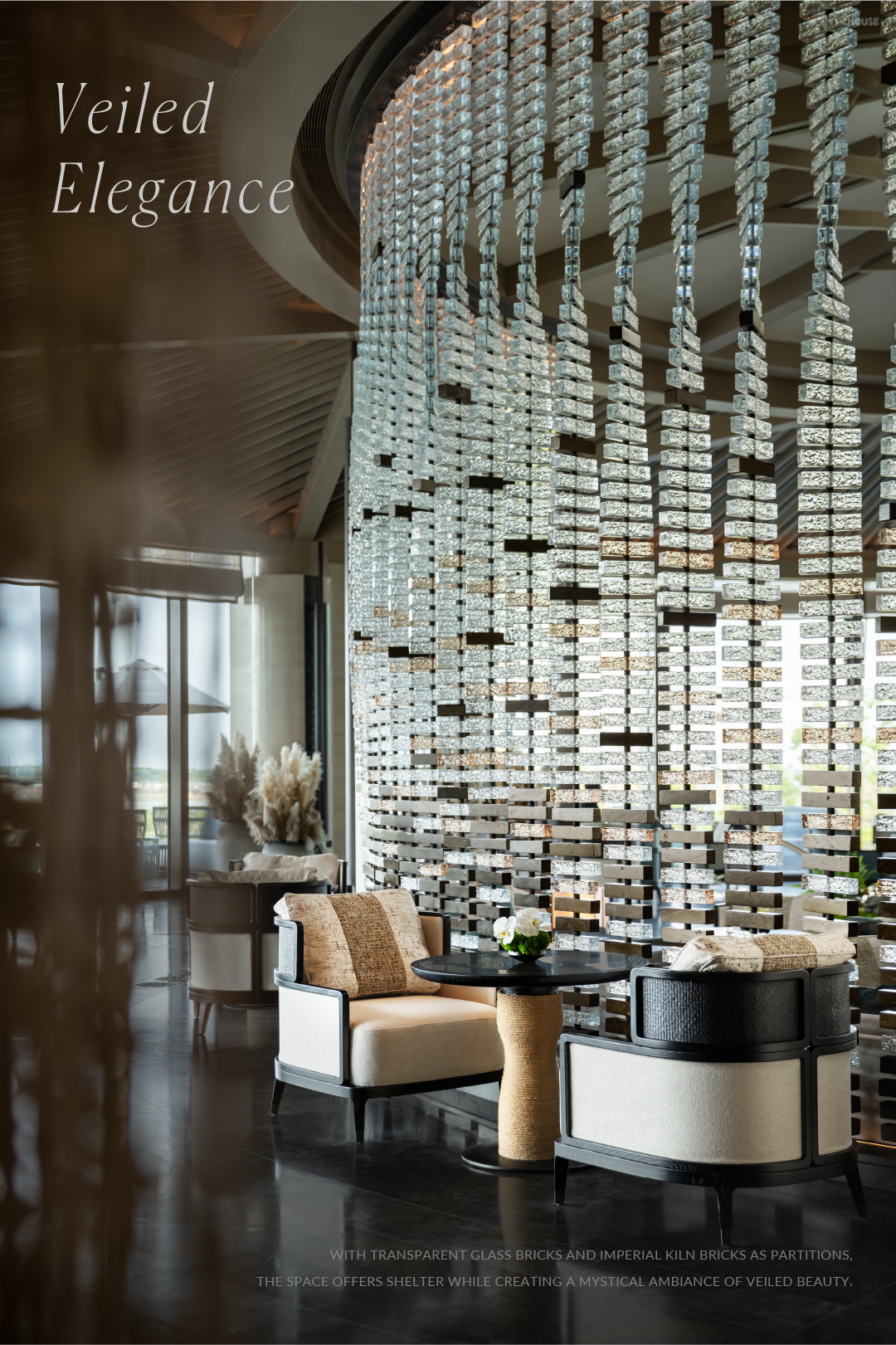 落客处水景与门洞互为映衬,写意江南园林的经典月亮门。大堂抬高使其悬浮湖面,邀人临风凭虚,揽湖天一色。中心下沉式大堂吧,创造视觉焦点并巧妙融合空间,层层递进丰富感官。