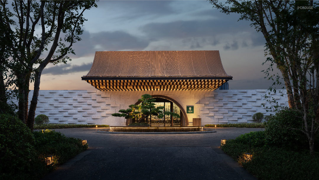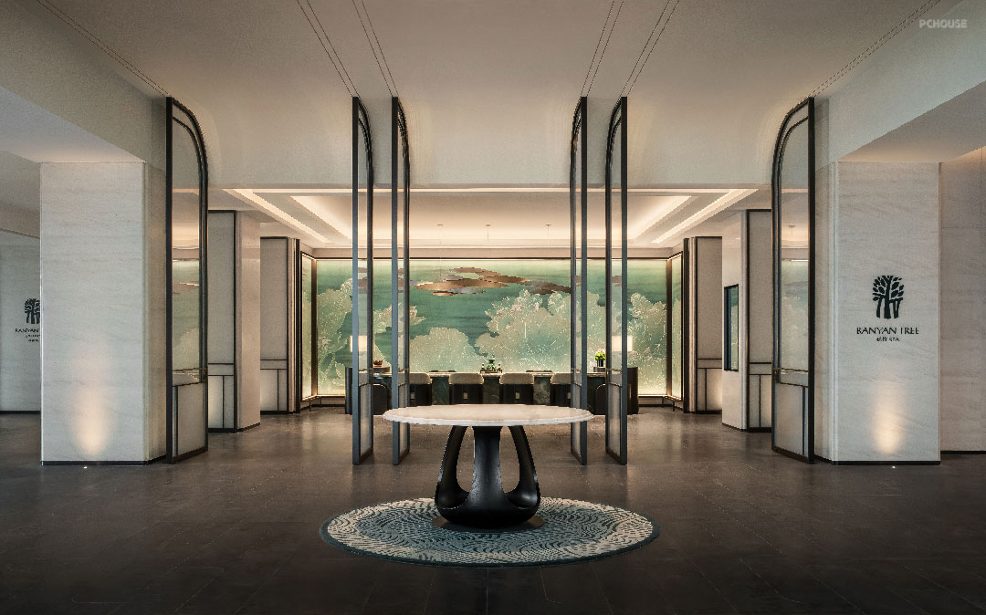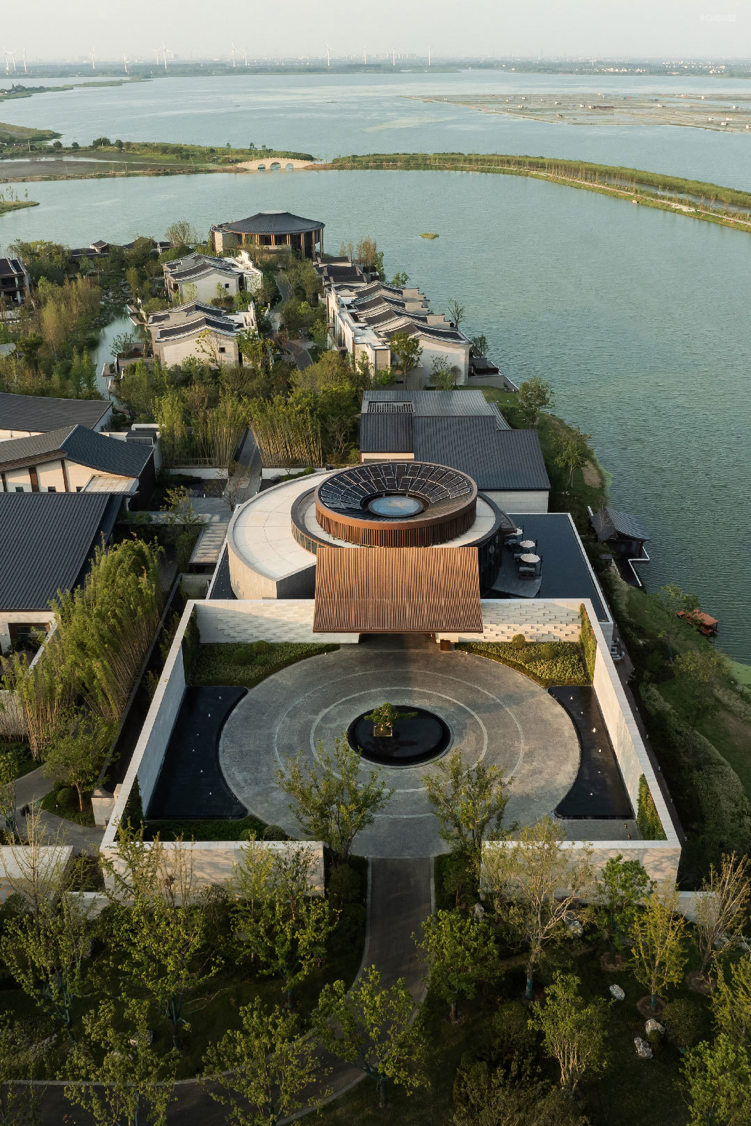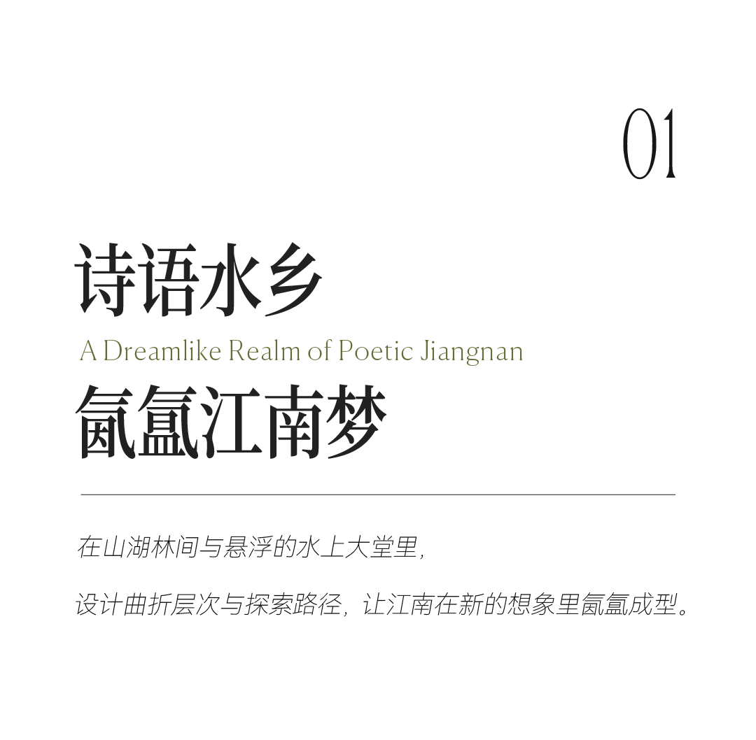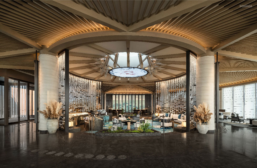 落客处水景与门洞互为映衬,写意江南园林的经典月亮门。大堂抬高使其悬浮湖面,邀人临风凭虚,揽湖天一色。中心下沉式大堂吧,创造视觉焦点并巧妙融合空间,层层递进丰富感官。