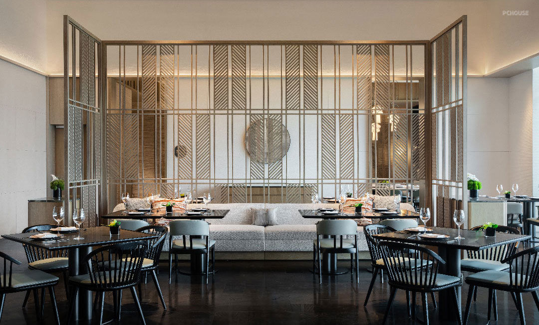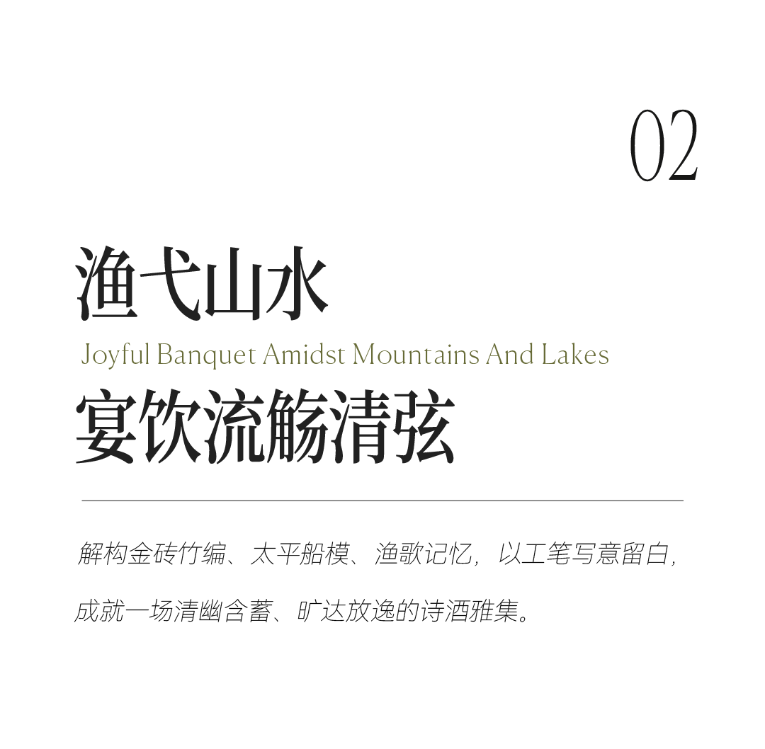越过水景小园,步入全日餐。疏朗开阔的空间里,线与面交织出美的韵律。竖条御窑金砖或有序嵌入墙面,或穿插翡翠纹理接待台。太平船模解构再译,褐铁色碎片攒动点点渔火凌空,恍然踏入水巷枫桥。