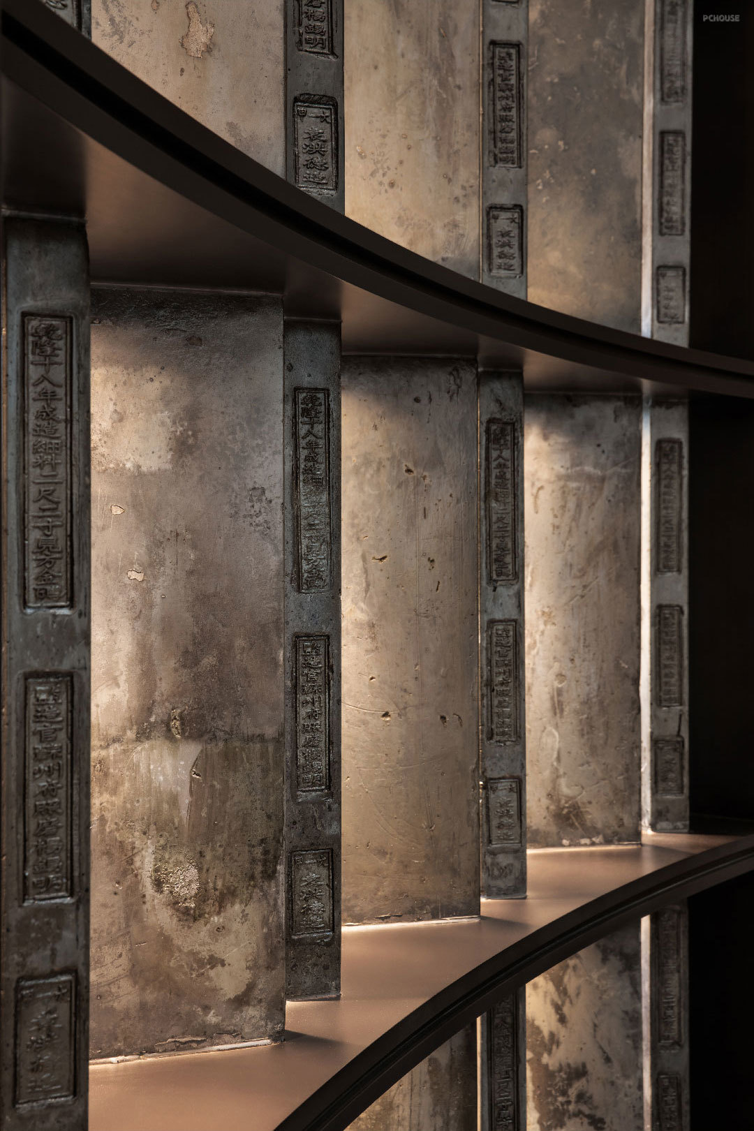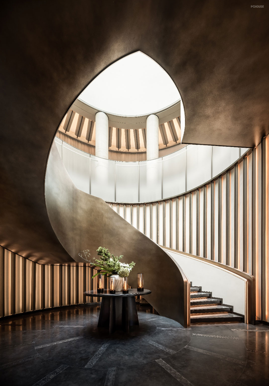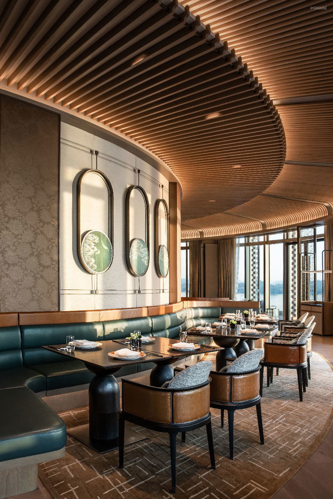 回环,是中心天光透漏,是天花层层蜿蜒,是扇形的金砖屏,是旋转的梯,是迂曲的廊,是270°湖景的无穷曼妙水波。隔不断、望不尽,以天井为圆心,将970平的中餐厅渗透出动态韵律,与人的目光、脚步悄然应和。