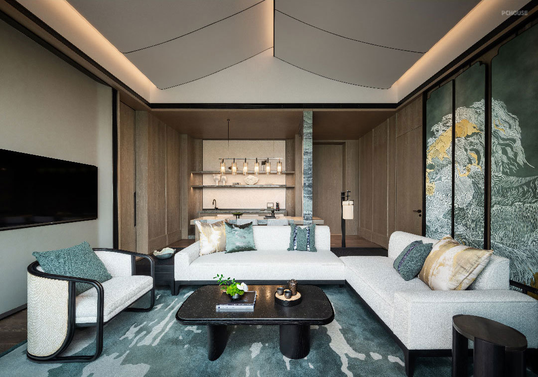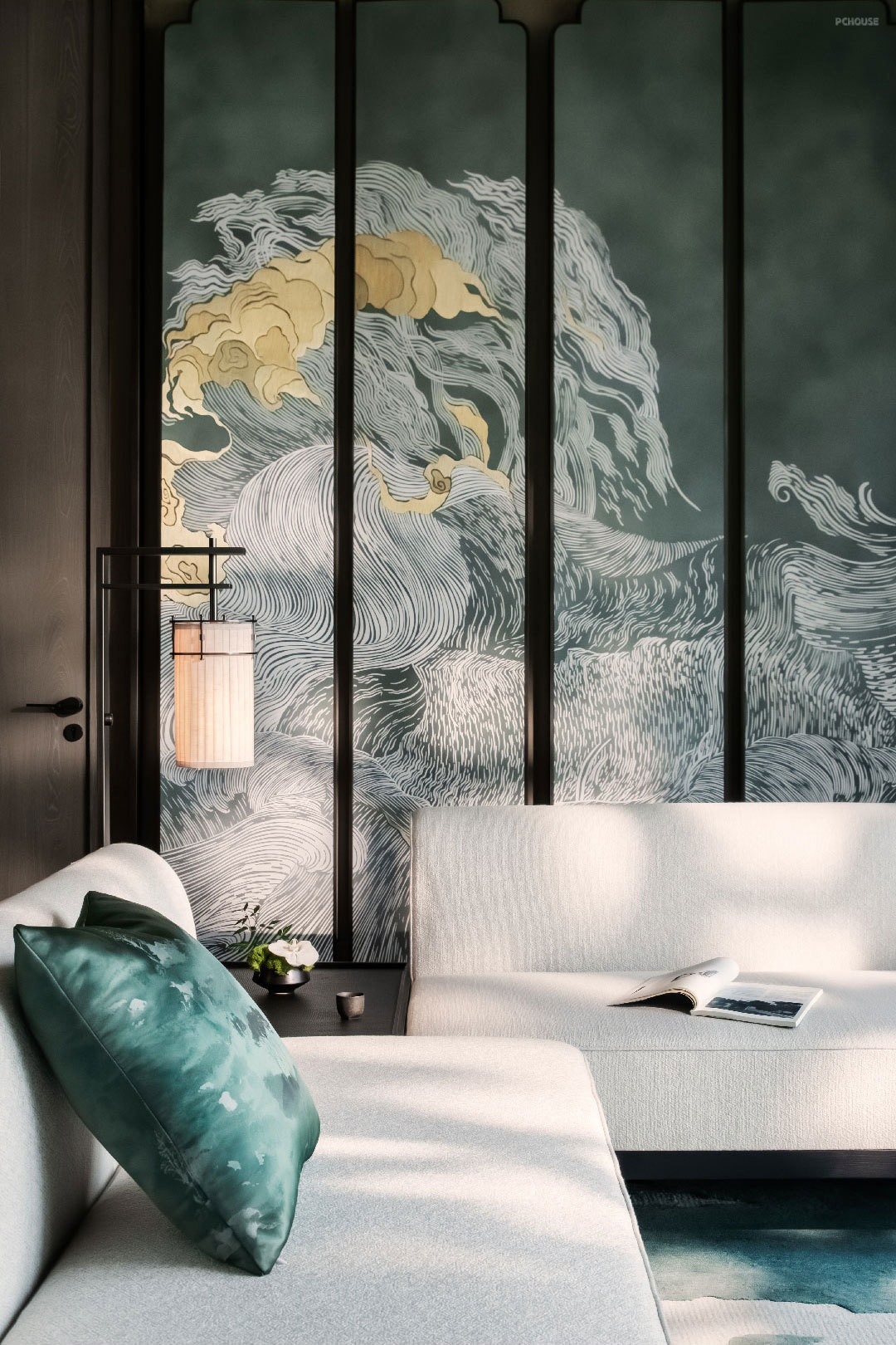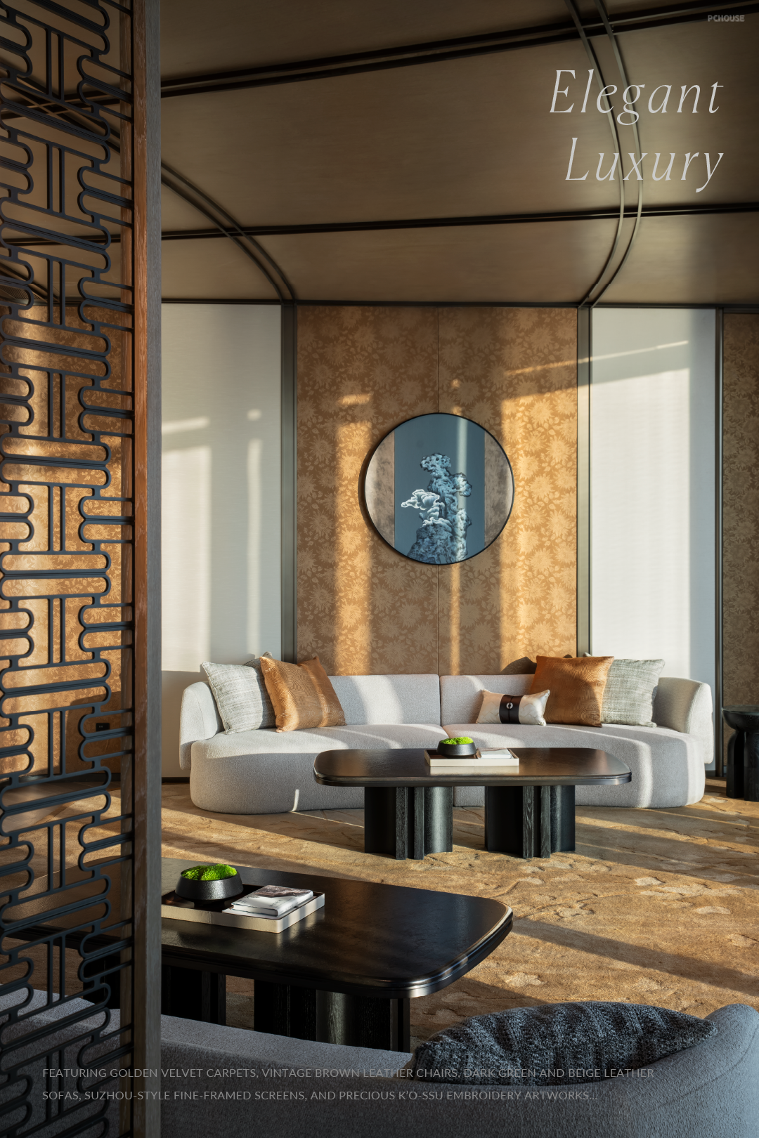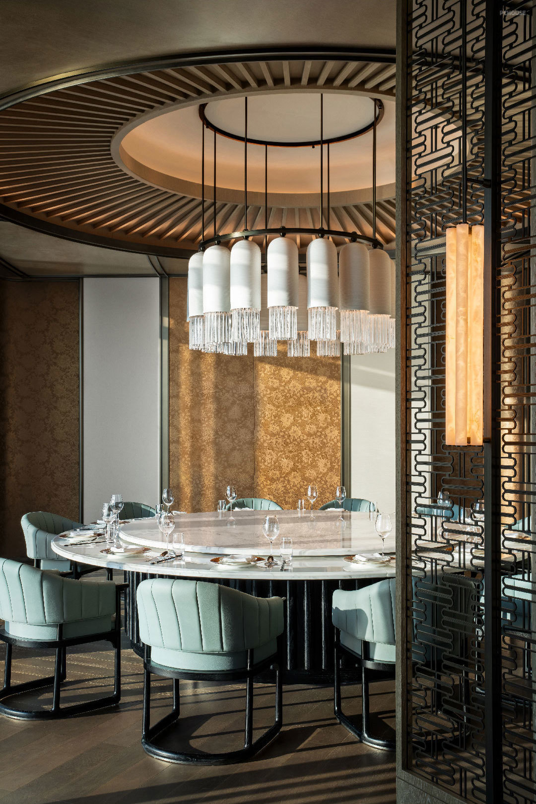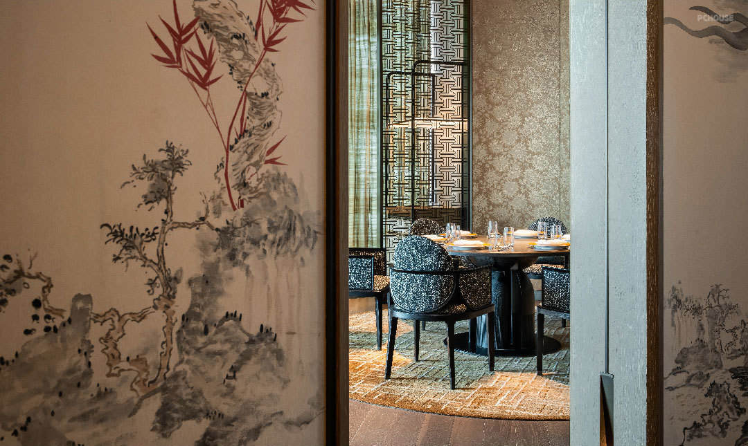 相比其它空间,中餐厅多了一丝繁复奢雅——秋棕色细绒地毯、黛绿皮革沙发,搭配古典苏绣团花图案、太湖石缂丝艺术品、水波镂空屏风……长风猎猎,盛宴渐歇,寒山寺的钟声叩响长夜,余韵不绝。