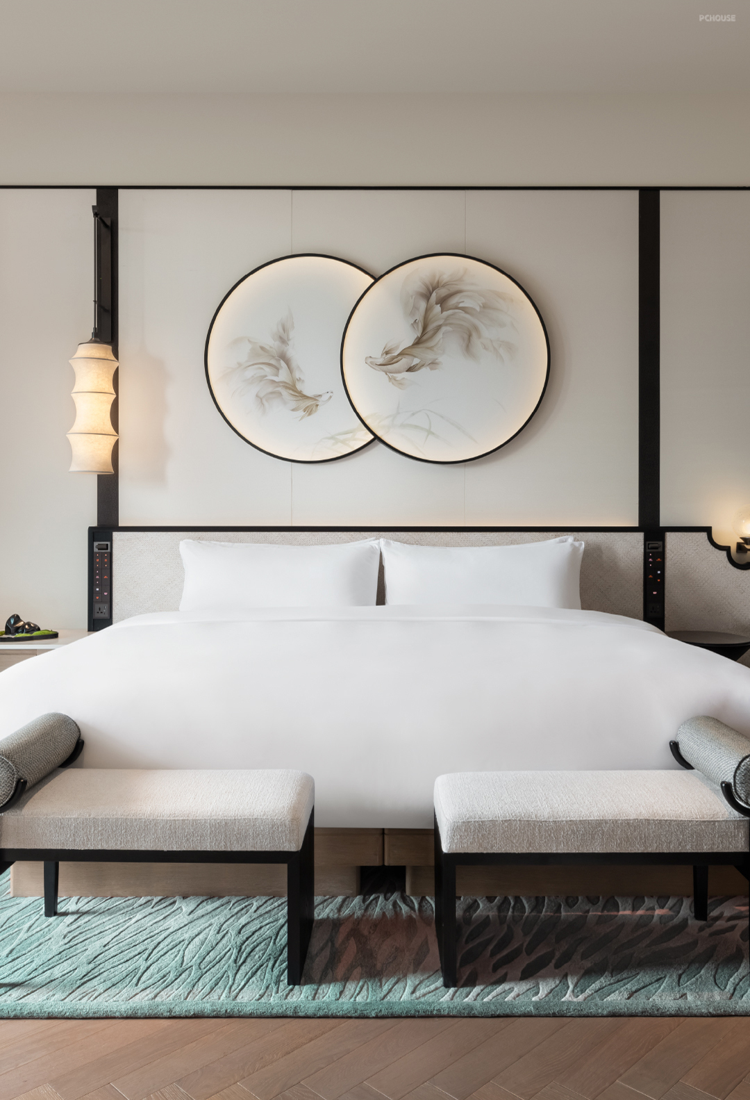 同时整体融入相城的隐喻符号,或破或重构,克制而丰盛。床屏取半阙海棠破形,屏风上卷起细雪疏浪,门把手镌刻相城琴弓的弧度……