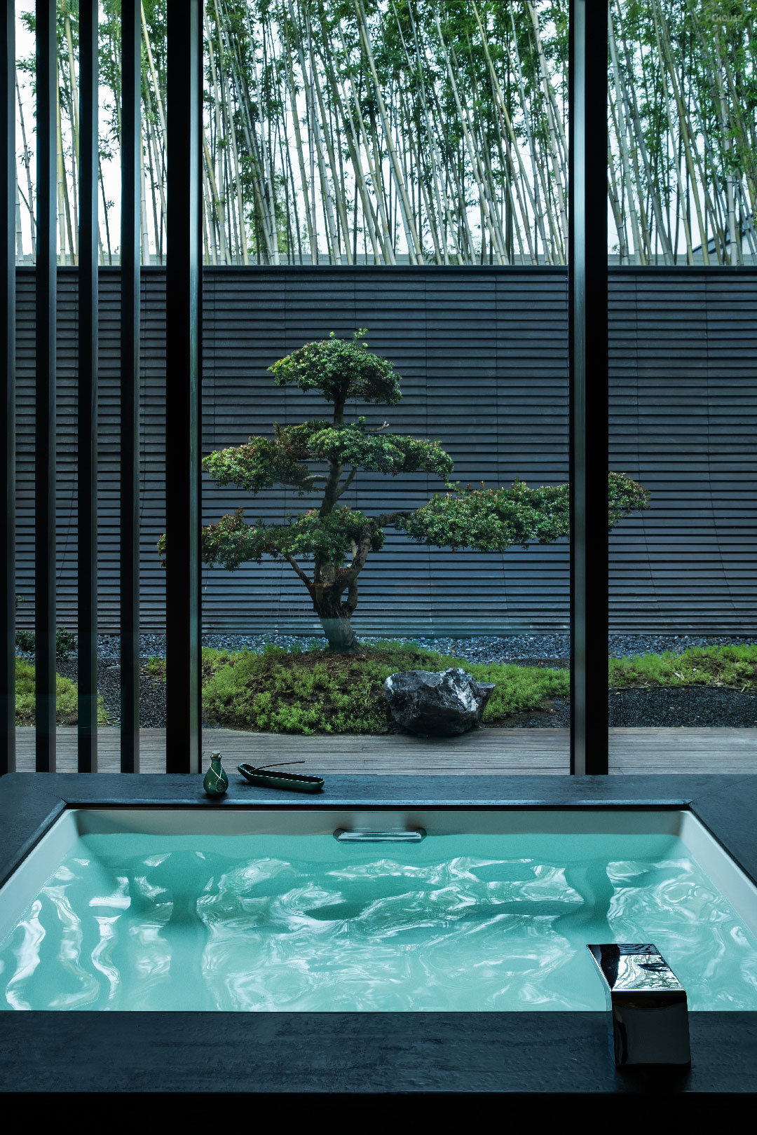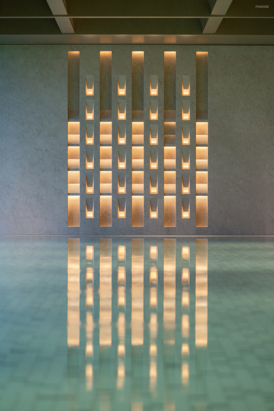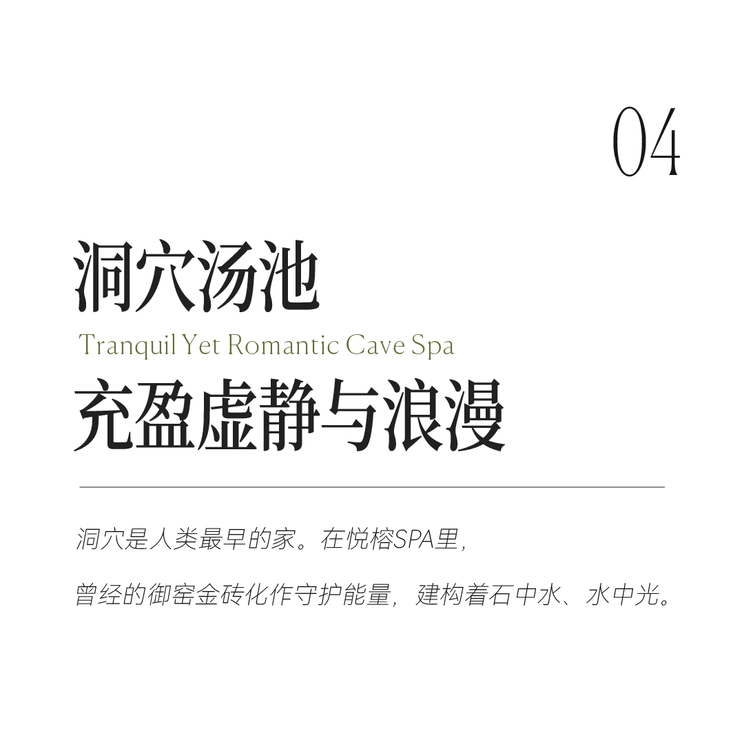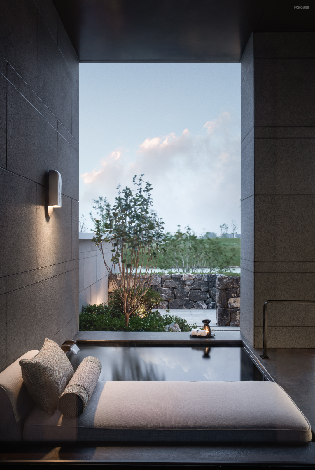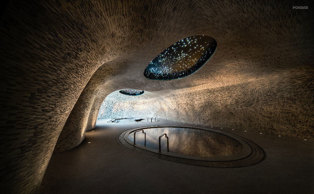 特色汤池以御窑意象打造洞穴式体验,块块方砖垒叠曲面肌理,小片星空映照私汤,原始的深邃幽暗提供了最佳庇护。水光游走,星汉灿烂,跋涉过万水暮色与千山风雪之后,我们终能确信身心归处……