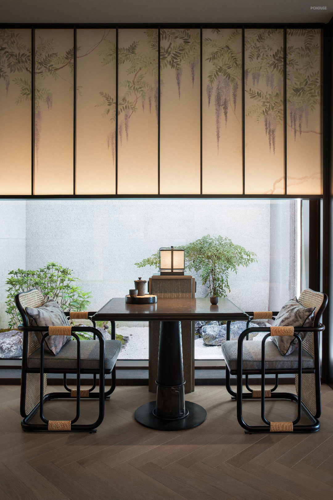 半帘紫藤屏风垂落,在引人入座时与窗外小景呼应,流溢生动气韵。天高云淡,物我皆醉,忘了时间。