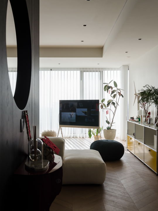 客厅作为家庭的核心,是生活中的一片净土,?也是诗意的栖息地。结构与形状交错跳跃,利用统一的色系收拢视觉,简约的基调中,置入灵动的乐趣。