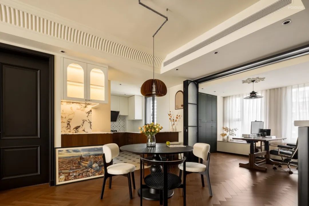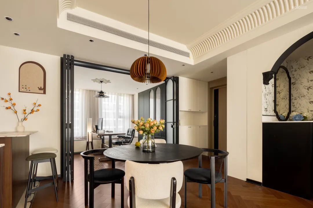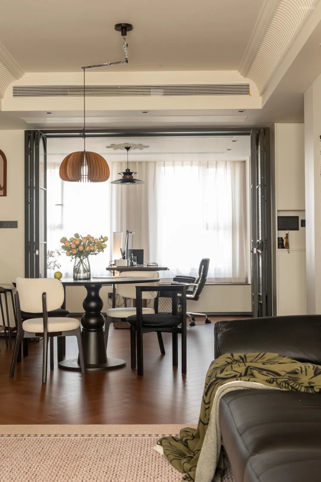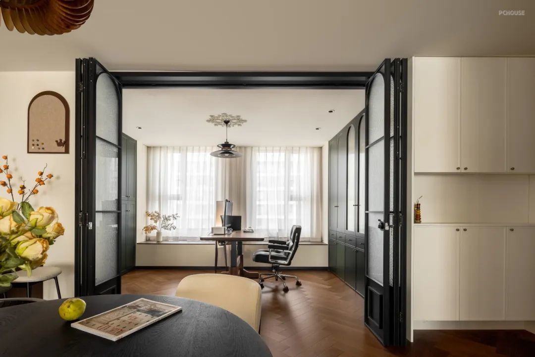 半折叠的复古移门让空间变得更加灵动,打开折叠门,书房与客餐厅的人可以随时交流互动;关闭分隔出两个独立而私密的空间,适配多样化的生活场景与需求。