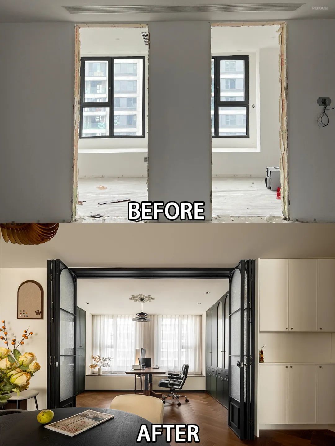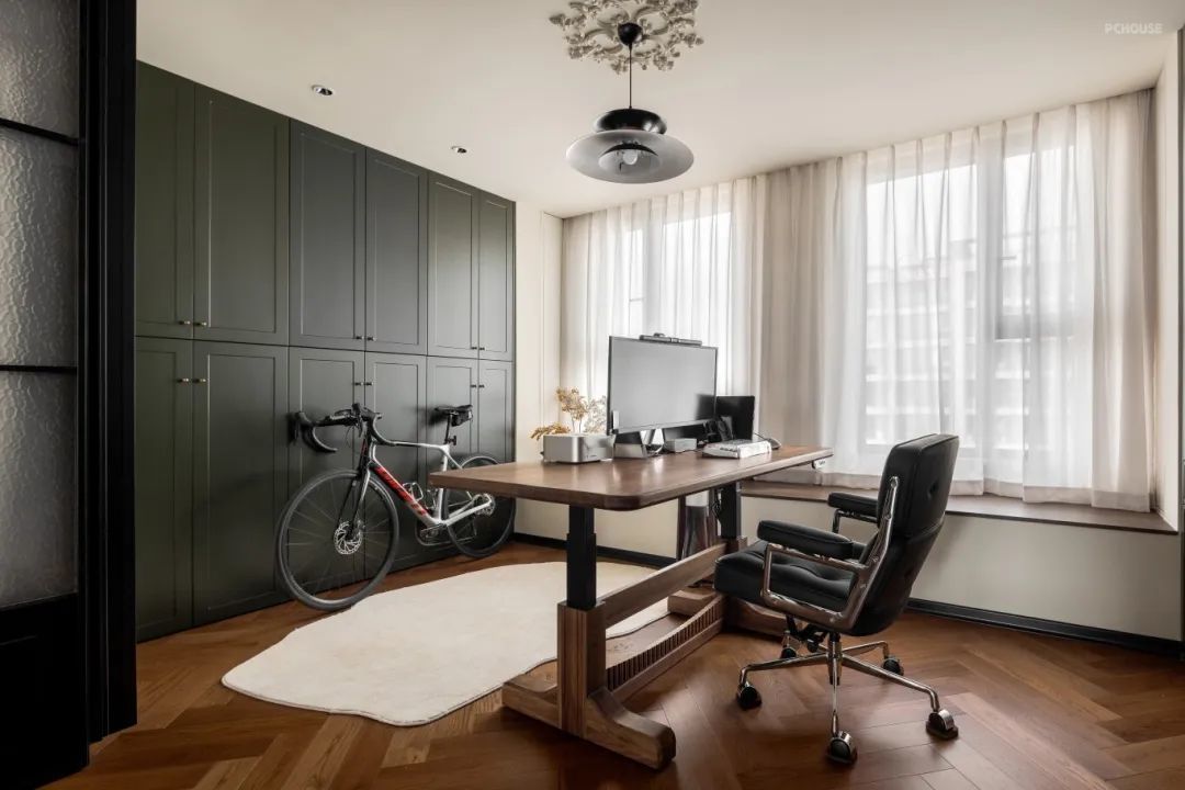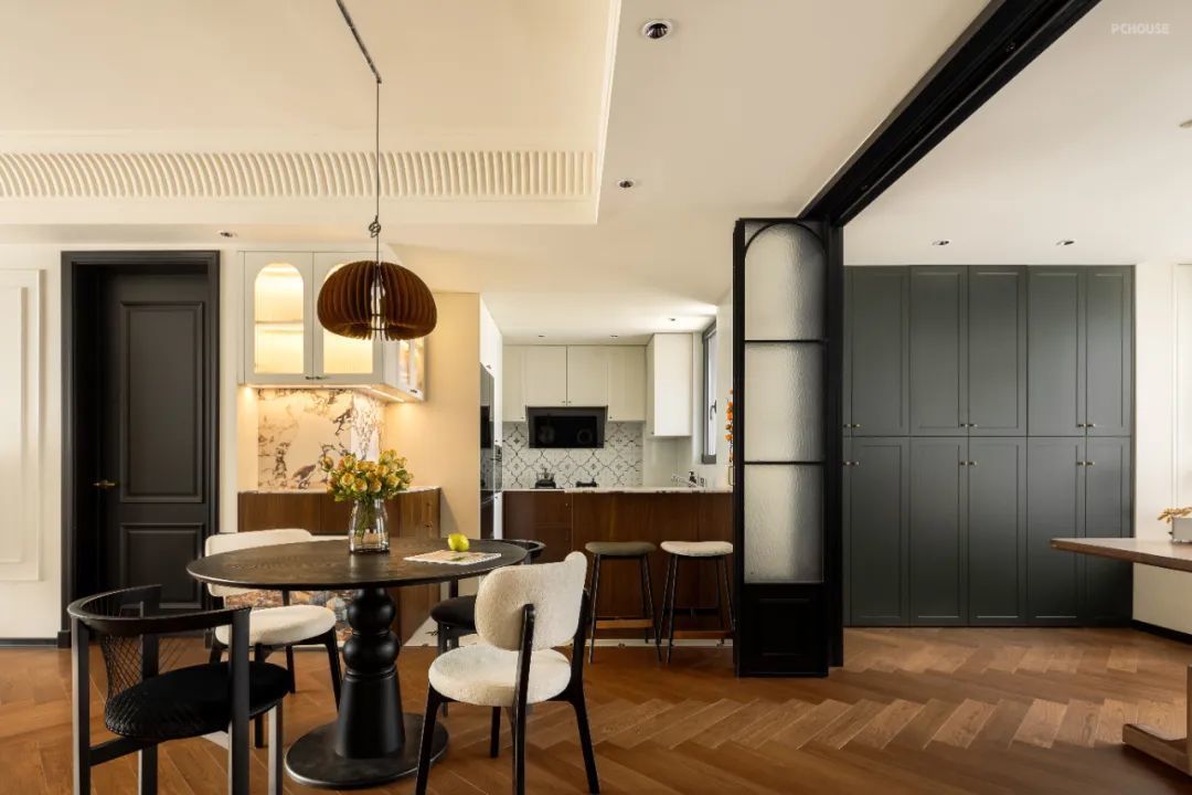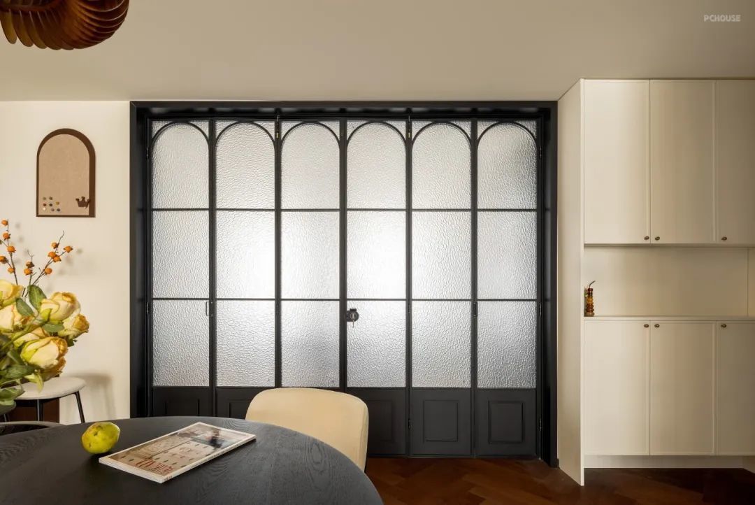 半折叠的复古移门让空间变得更加灵动,打开折叠门,书房与客餐厅的人可以随时交流互动;关闭分隔出两个独立而私密的空间,适配多样化的生活场景与需求。