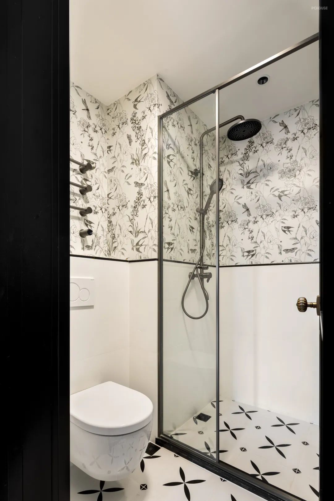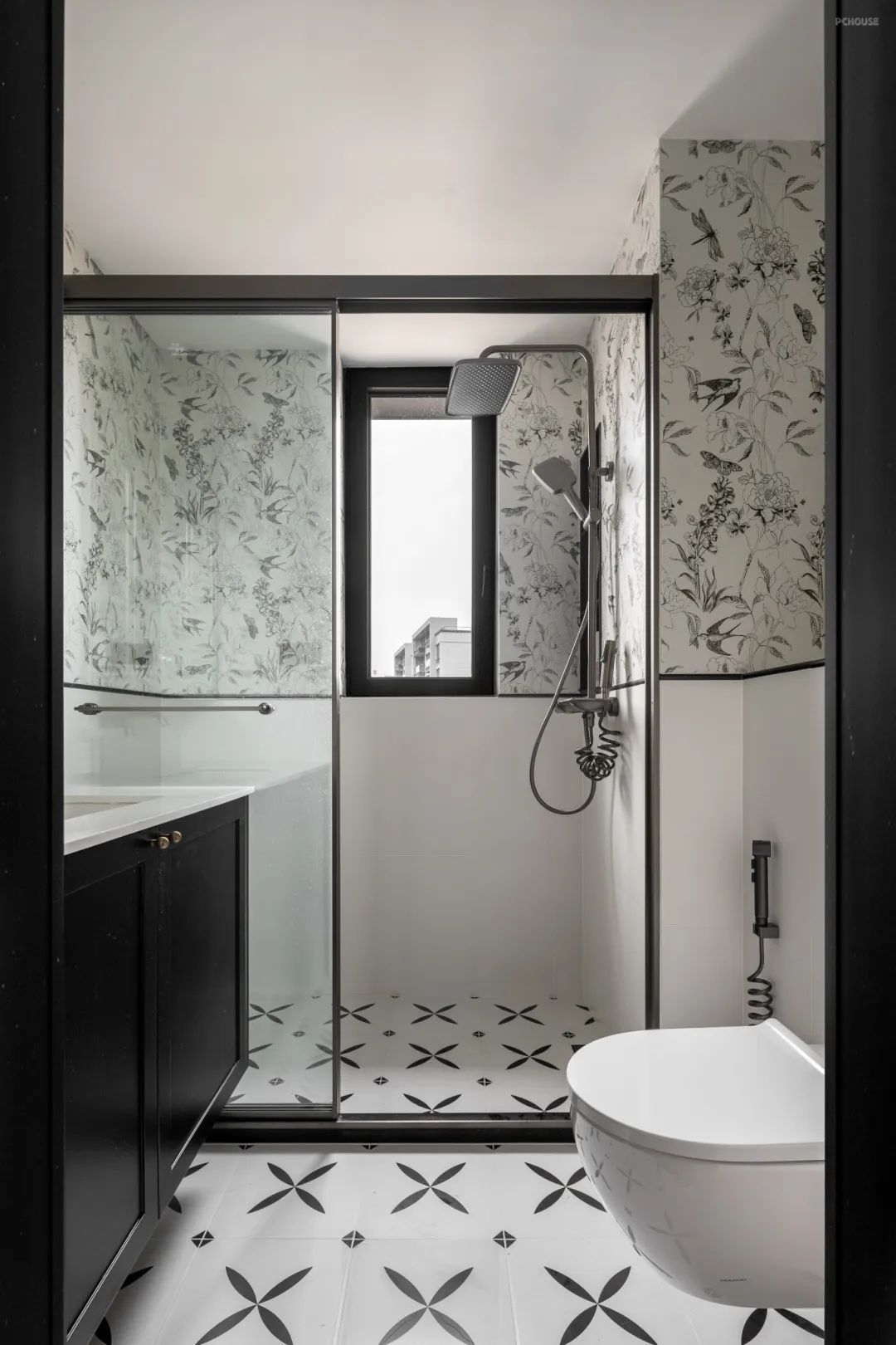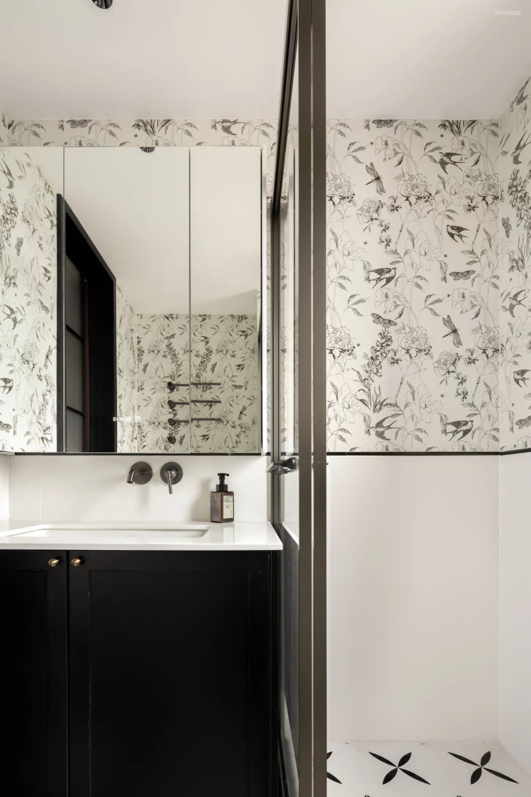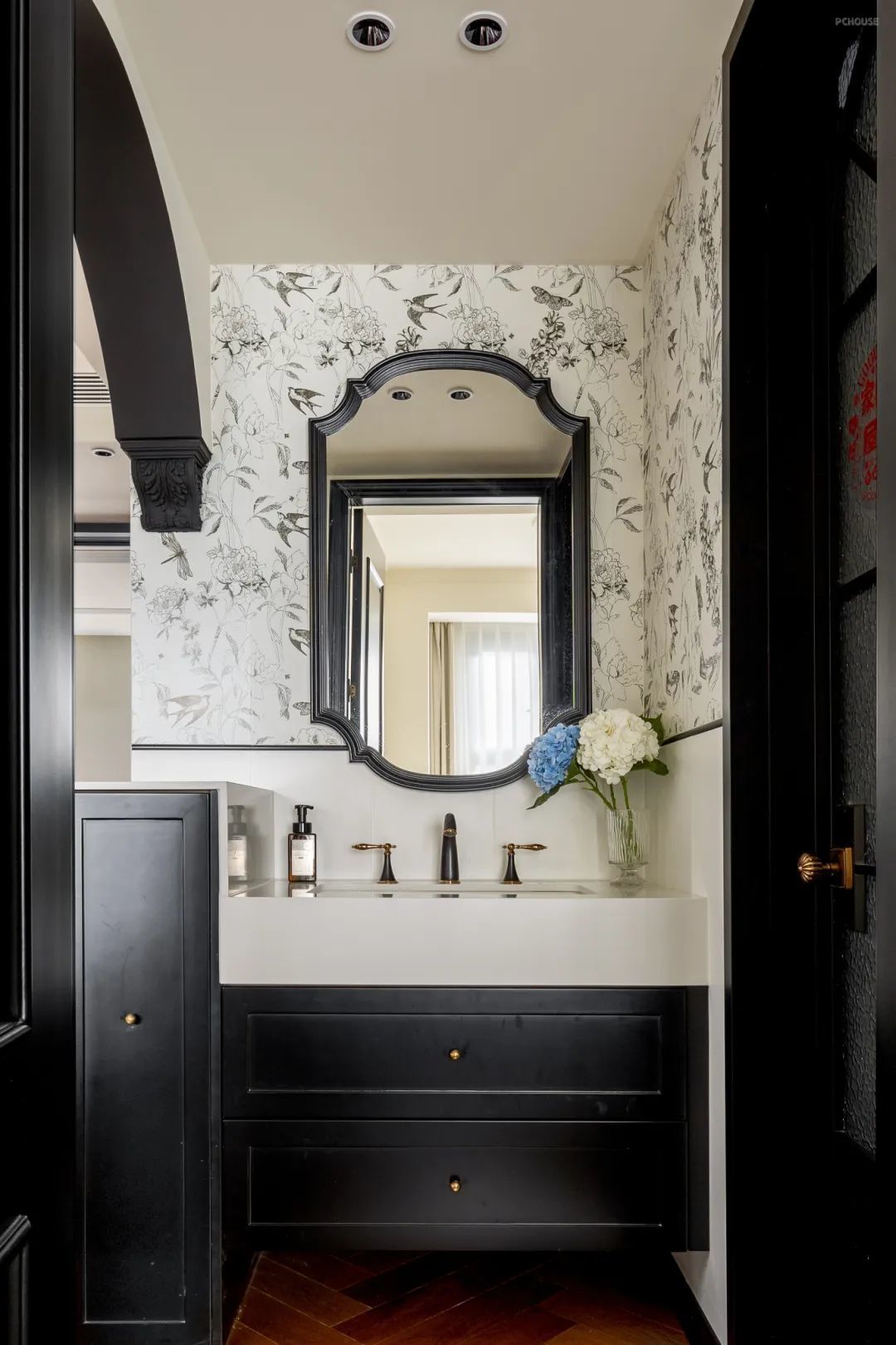 黑白风洗漱区,法式风的墙砖,优雅独特的造型镜面,为空间增添一抹独特韵味。