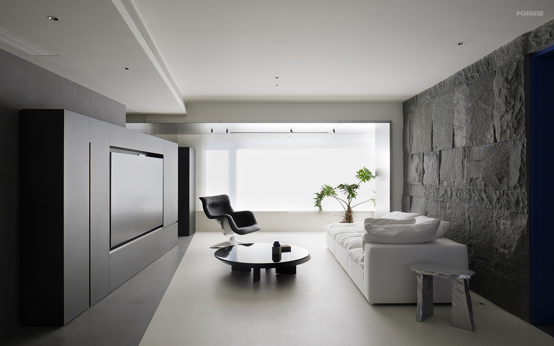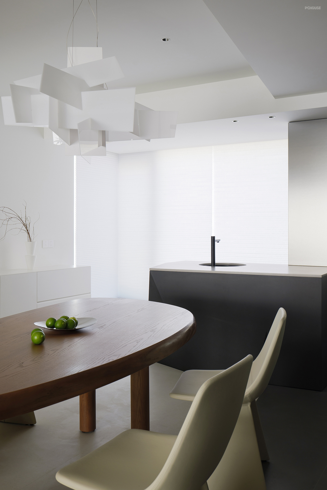 以黑白对比区分餐厅与客厅区域,黑与白的对峙被赋予戏剧般的张力。