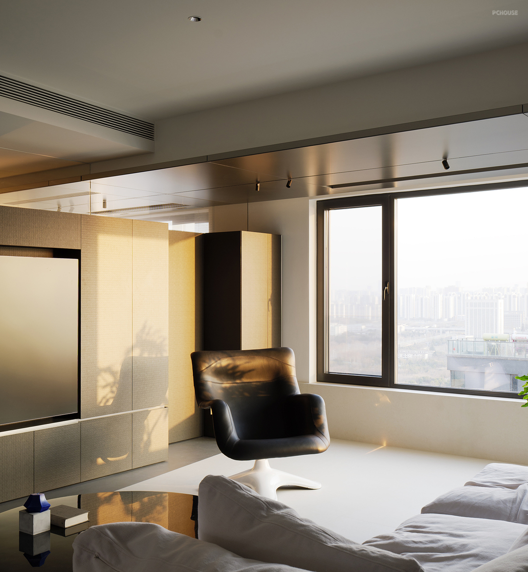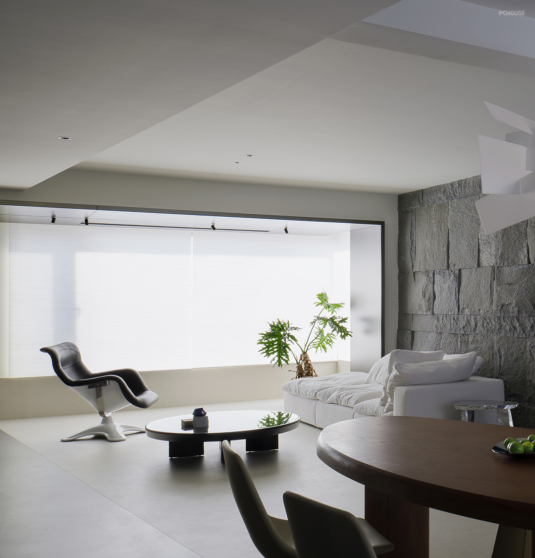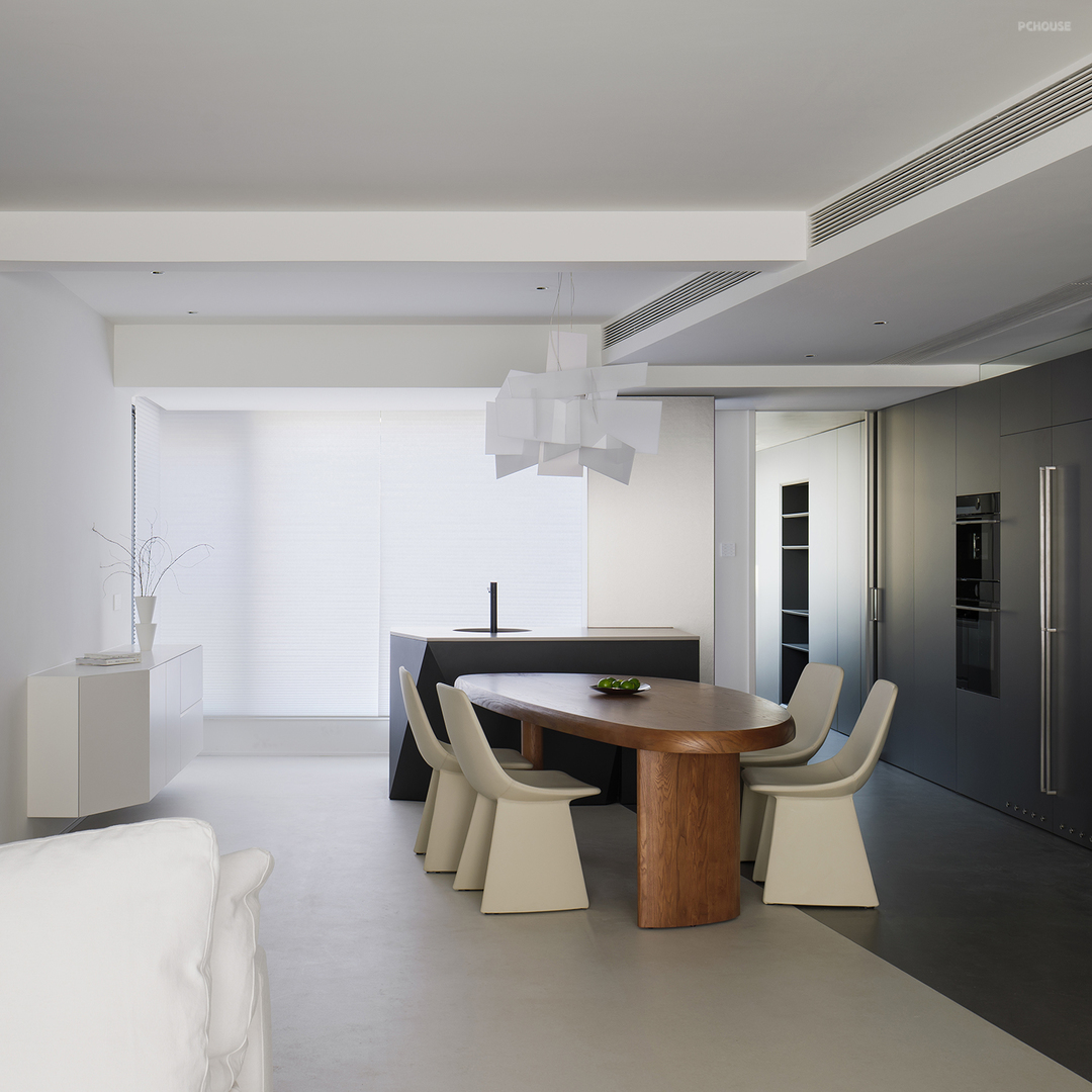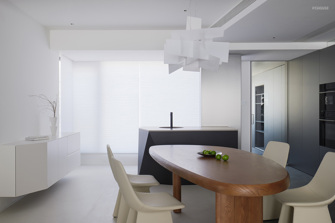 轻盈如昼,流淌着敞亮自由的白,裹挟着金属的冰冷触感,将光的柔软与金属的坚韧交织为一,折射出一种既疏离又亲近的氛围——它疏离于喧嚣的世俗,却亲近于居者内心的秩序与澄明。