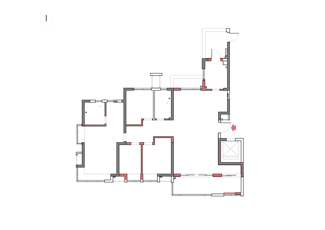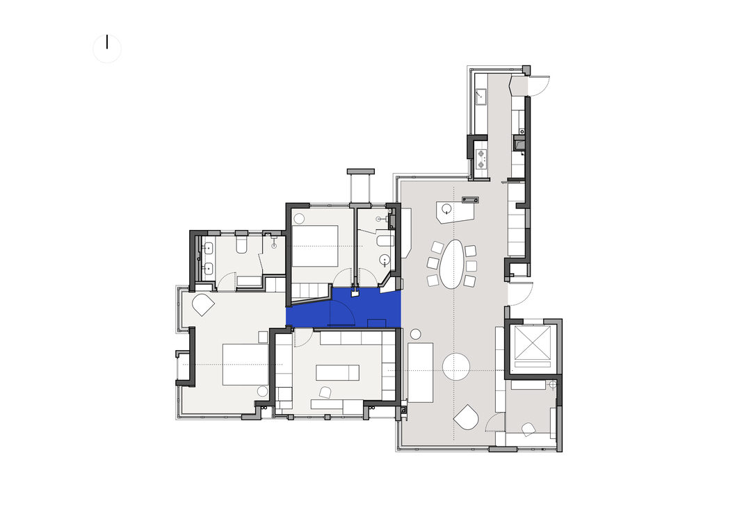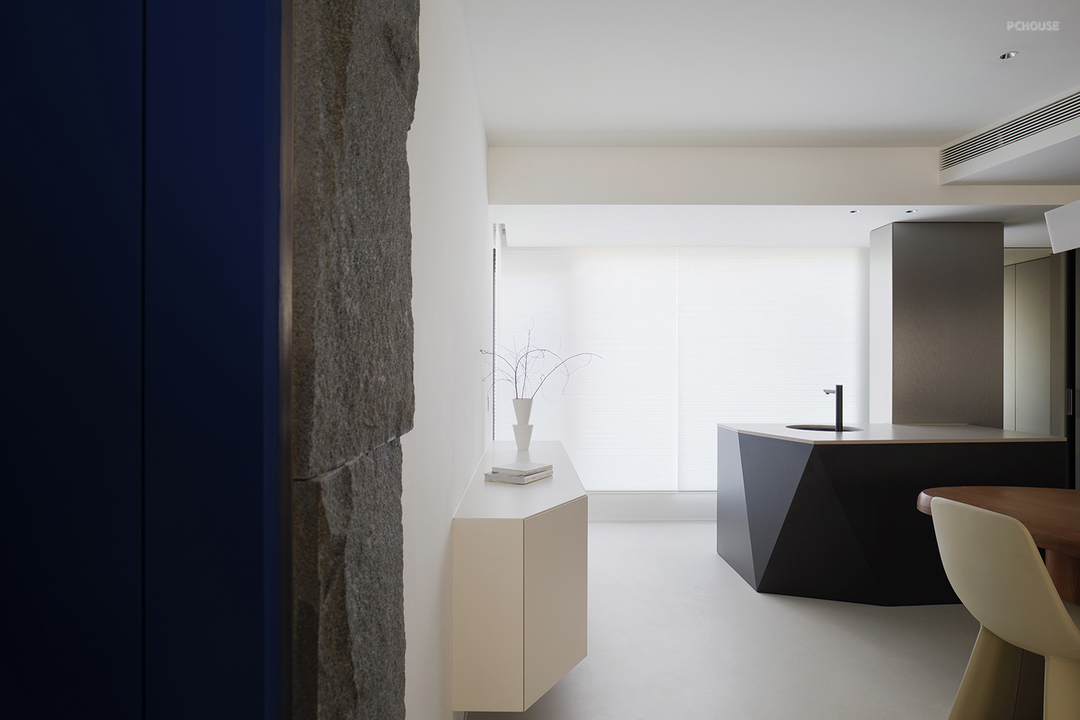 受限于承重墙的刚性束缚,走道的夹角以八度挣脱平庸,沿此微妙的角度,于客餐厅的纵向轴线上施以八度的切分,一条以八度切线为灵魂的线索贯穿居所的经纬,勾勒出空间脉络。