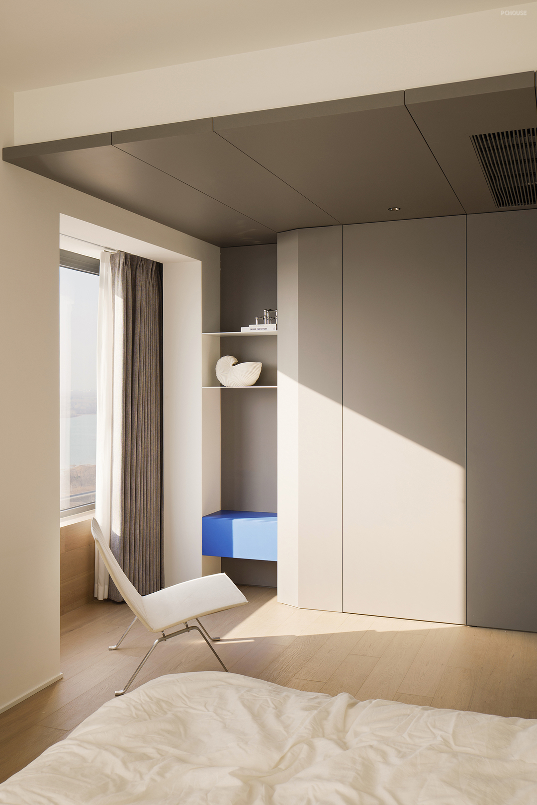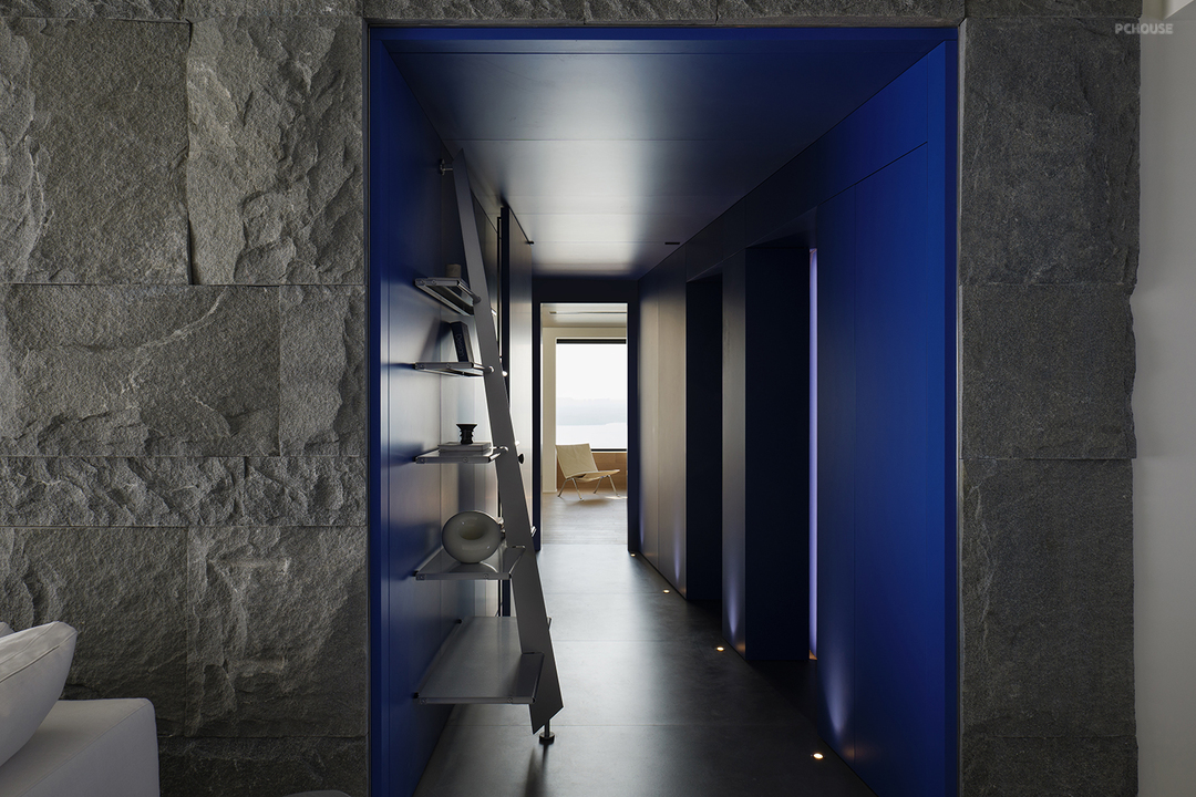 克莱因蓝与莫奈灰石皮的碰撞,勾勒出一种刚柔并济的美学:蓝色通道如海浪般绵延,引领视线穿越客厅的辽阔、走廊的幽深,直至卧室的私密,湖光在尽头若隐若现。