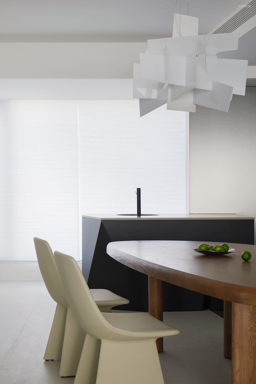 黑色隐匿于柜体与厨房,沉稳如夜,湖水的深邃在此凝结,透出一种内敛的秩序感;白色则轻盈漫溢于客厅与餐厅,宛若晨曦洒落湖面,敞亮而通透,承载着日常的欢愉与对话。