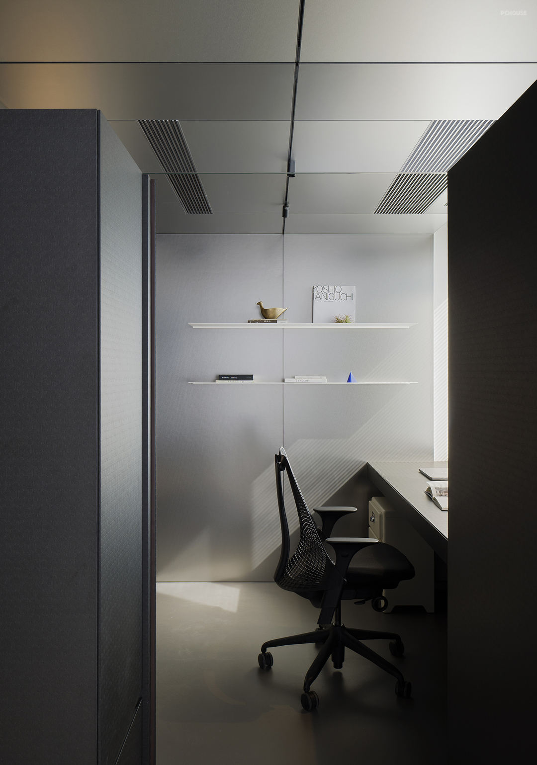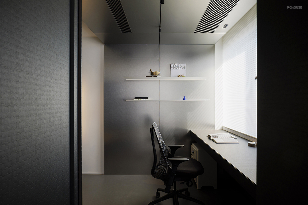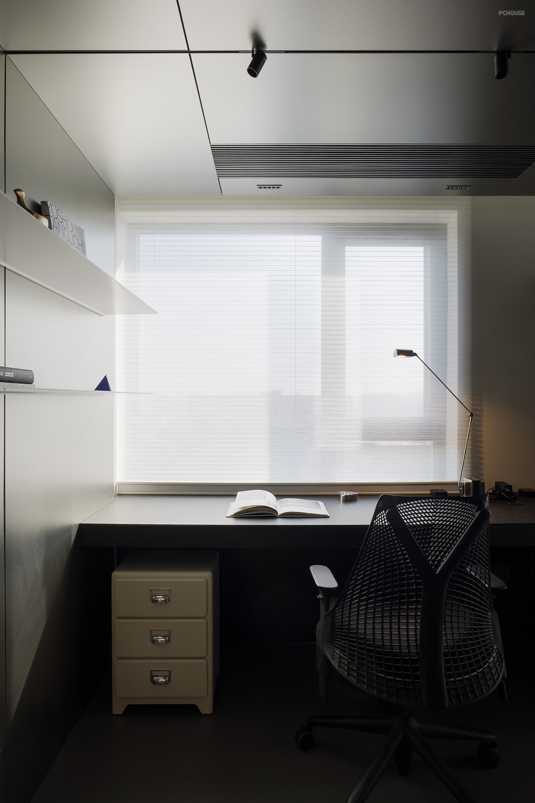 而拉丝不锈钢的肌理,如同一缕冷峻的光流,自阳台顶面蜿蜒至书房,宛若一条隐秘的线索,贯穿两处场域,将纵深感悄然延展。