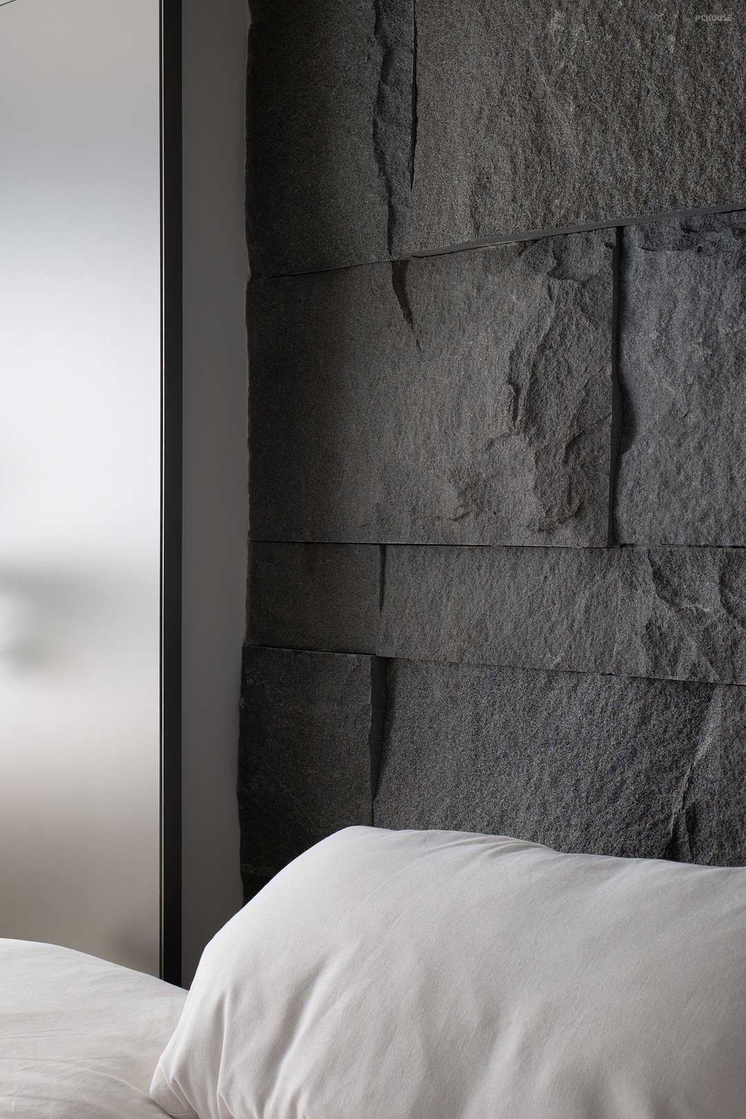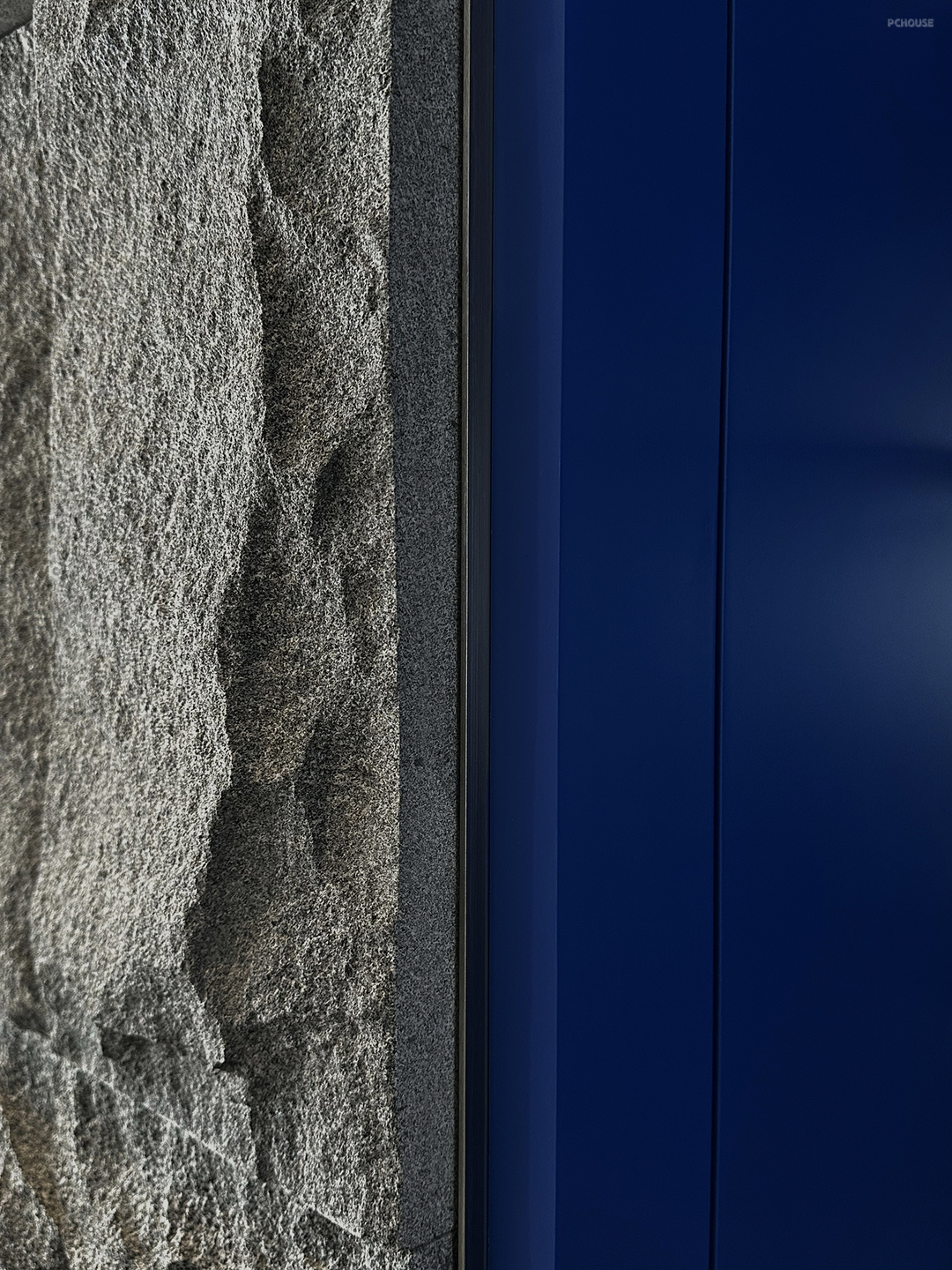 他偏好粗犷质地的原始触感,于是莫奈灰石皮被选为主调色彩元素——其斑驳的纹理与沉静的灰调,既似风化岩石的坚韧,又如退潮后海滩的低语,散发着未经雕琢的自然力量。