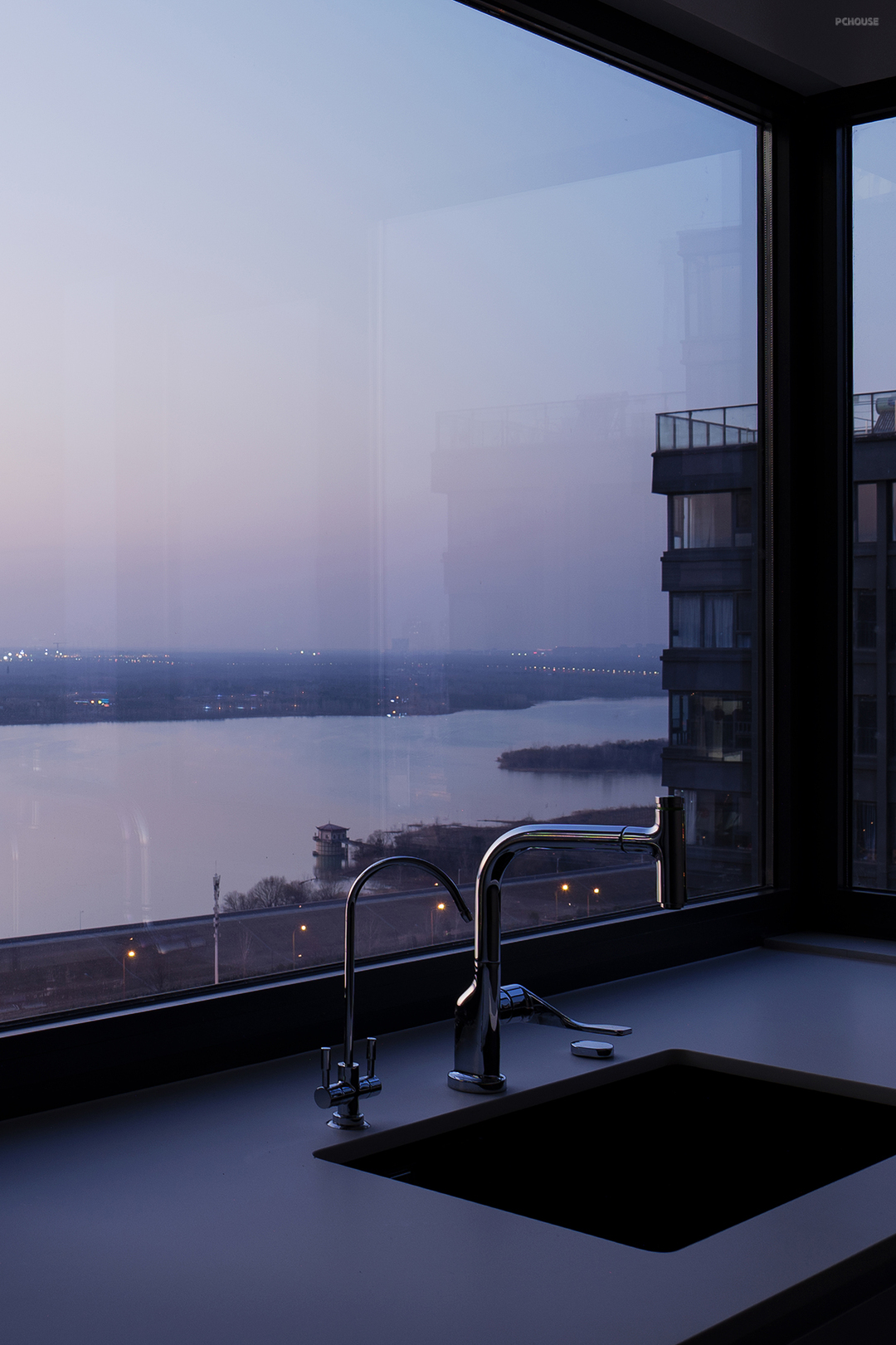 吊顶的拉丝不锈钢以细腻的纹路与微妙的金属光泽,既是对粗糙与平滑的平衡,又为空间注入了一股未来主义的锐意,如镜湖般与窗外的水库遥相呼应。