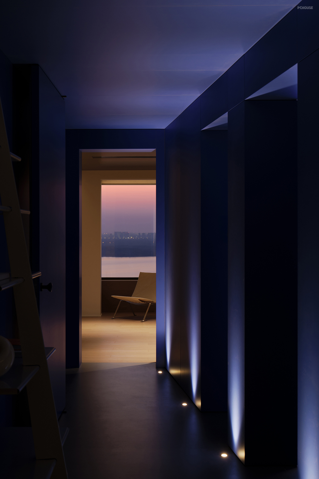 原建筑南北朝向,西侧依傍水库,为营造开门即揽水色的意境,设计以蓝色通道蜿蜒于公共空间与卧室之间,沿承重墙延展至极致,宛如一条静谧的河流,贯穿客厅、走廊与睡卧,视线如诗般流淌,直抵湖面的浩渺。