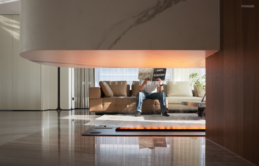 开阔明朗的大平层空间,拥有着极为优越的采光面,光线得以在室内毫无束缚地自由穿梭。客厅、餐厅、茶室与餐厨几块主要的公域功能区彼此连通,形成高度一体化的自由互动式空间,将观影娱乐、家庭活动、聚会社交等等所有的可能性集合。