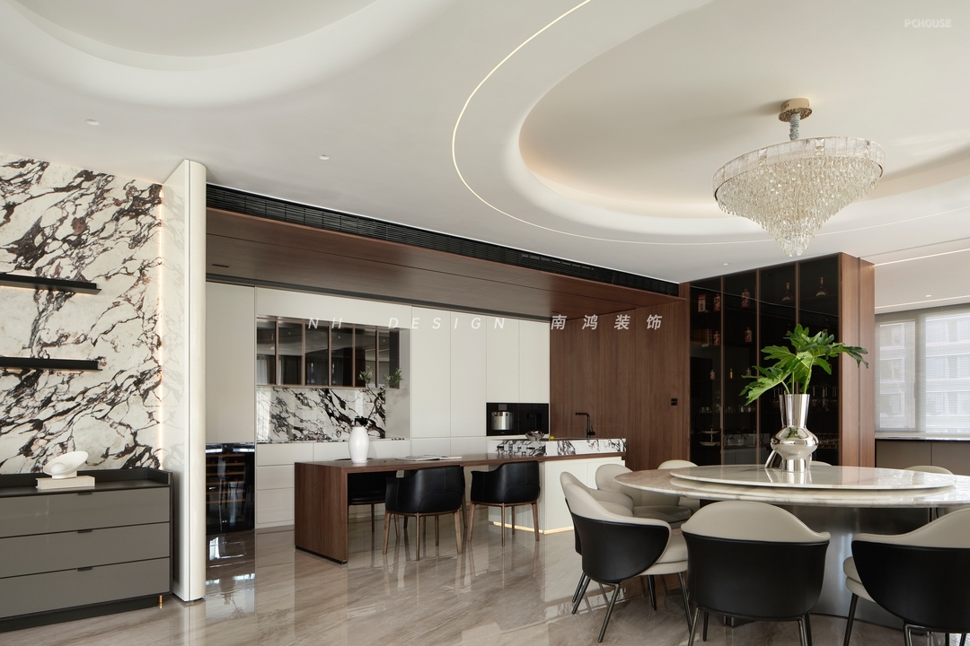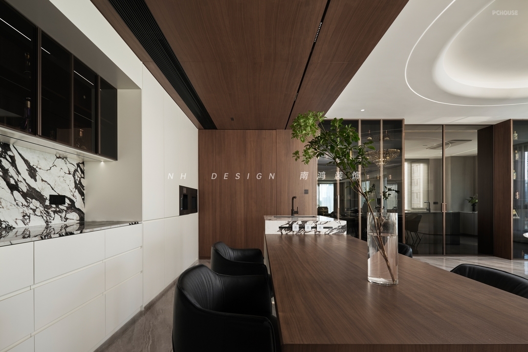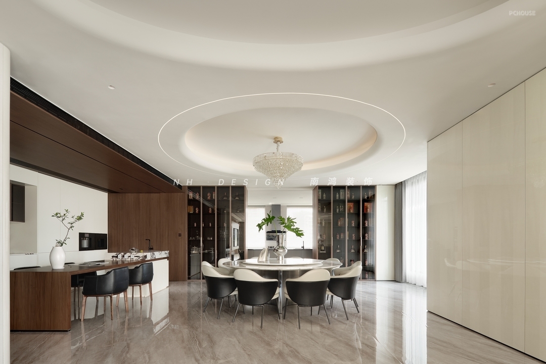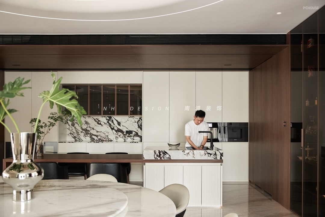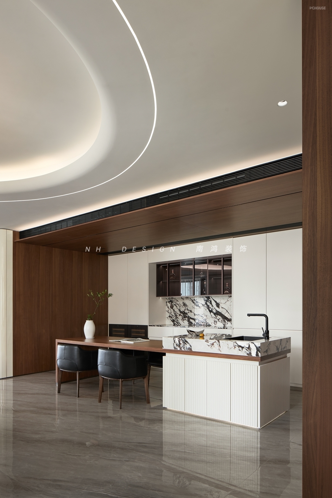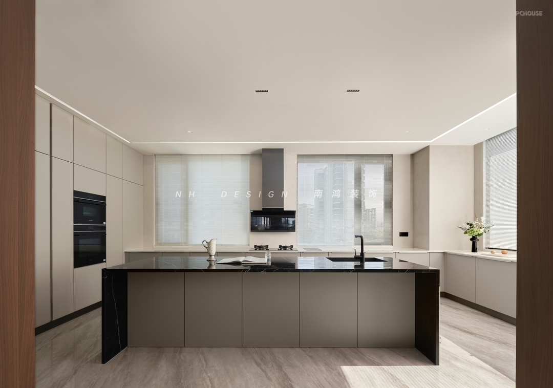 独立宽敞的中岛型中厨空间,以开放无阻的姿态衔接餐厅,流畅匹配区域间的对话,并通过色彩、线条、结构的干净配比,表达空间的统一性与纯粹质地。