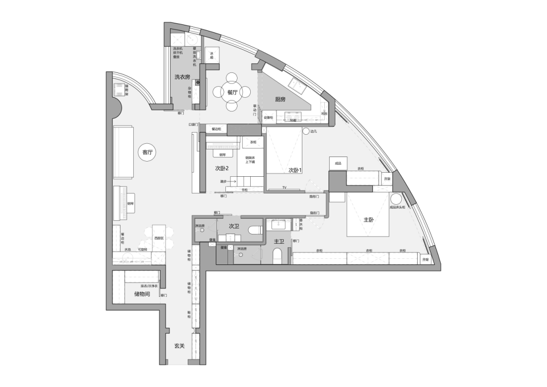 客厅的尽头是弧形阳台与洗衣房,阳光透过大窗洒落进来,斑驳光影在地面跳跃,绿植生机勃勃,呈现生活的美好画面。