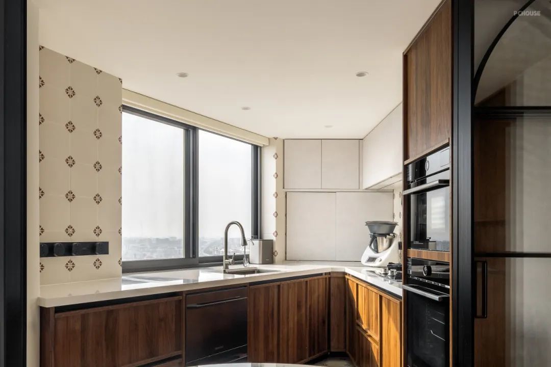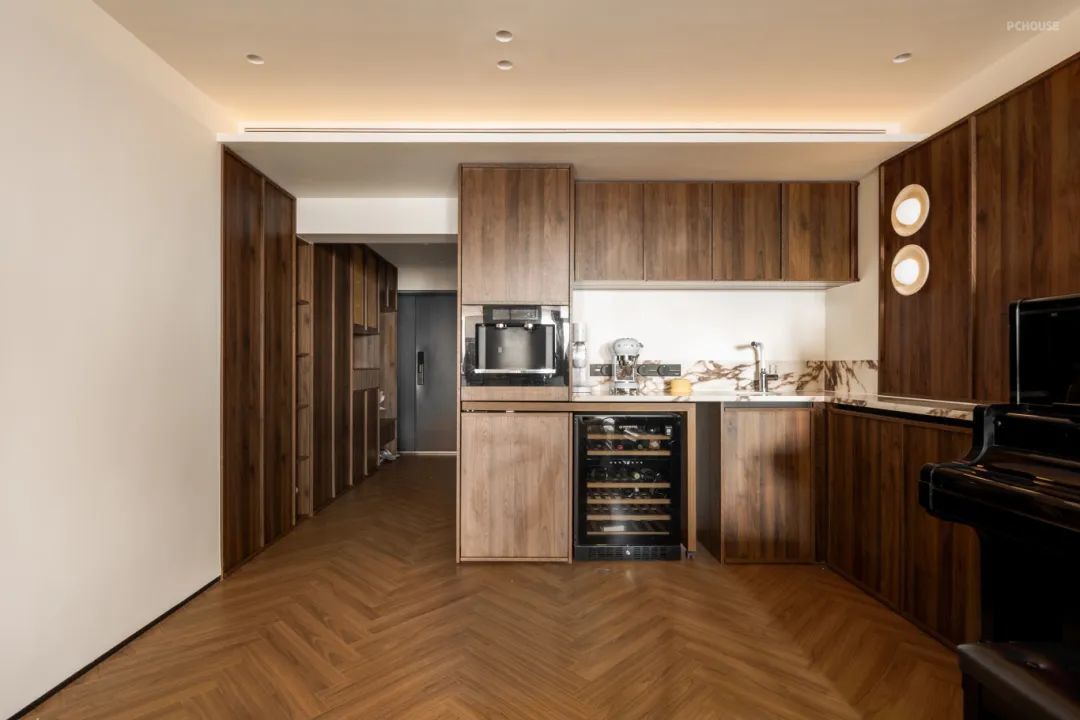 精心设计的西厨兼水吧区,吧台巧妙隐藏,可旋转展开,增添使用灵活性;嵌入式饮水机,便捷泡制茶饮、咖啡,尽享品质生活。定制餐边柜与蒸烤箱,融合美学与实用,让日常升华为生活的艺术享受。