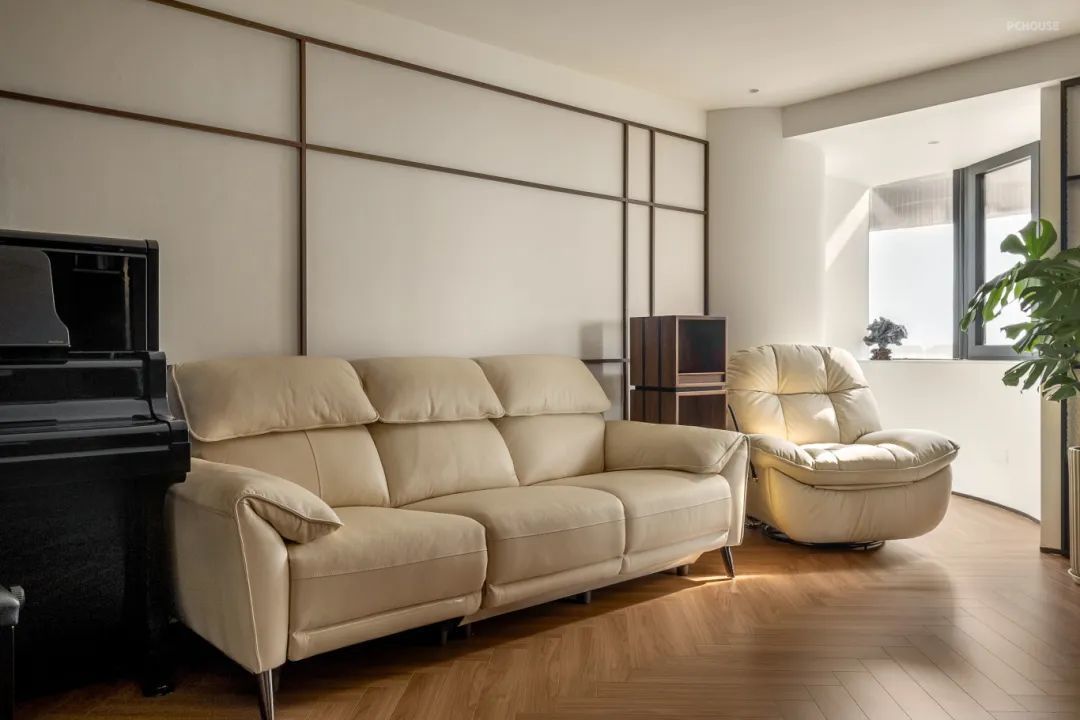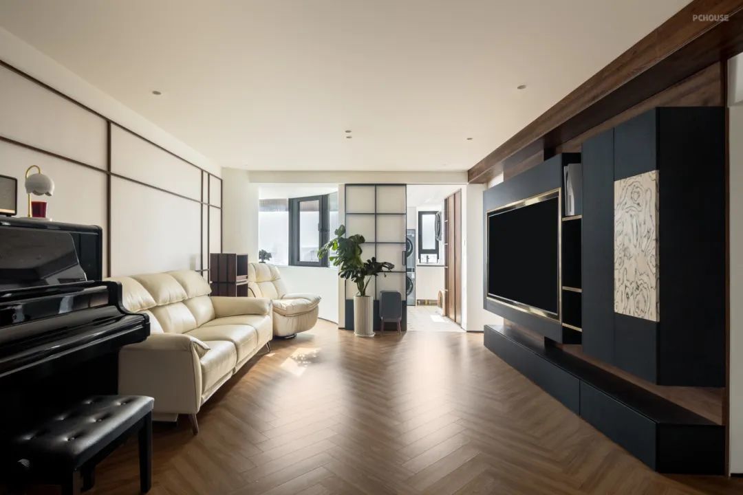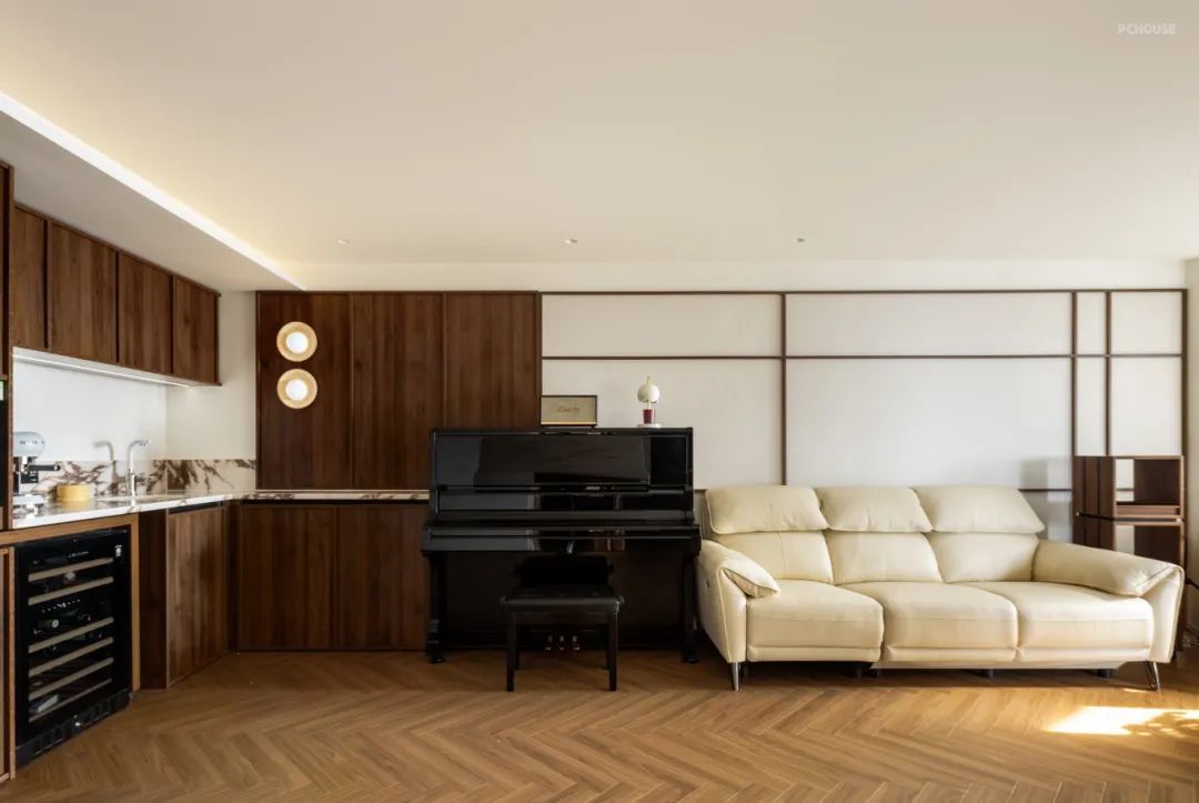 女主人是钢琴老师,在客厅沙发与西厨区之间放置一架钢琴,指尖跳动,琴音在共享空间中缓缓流淌。