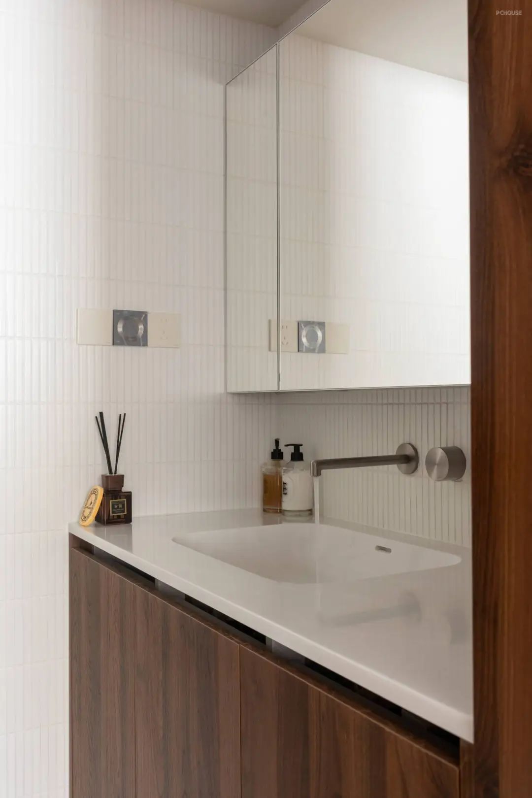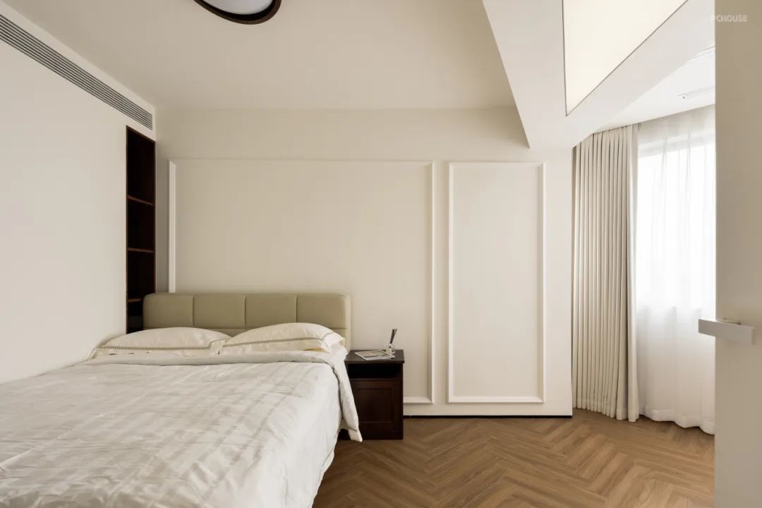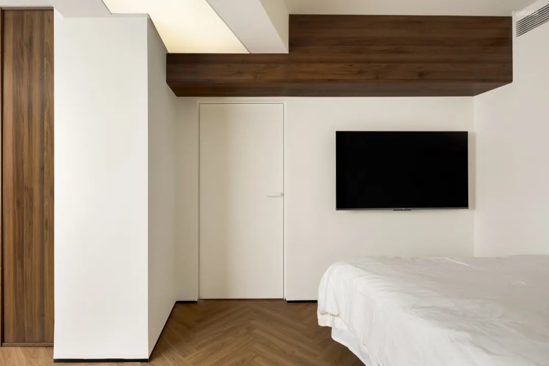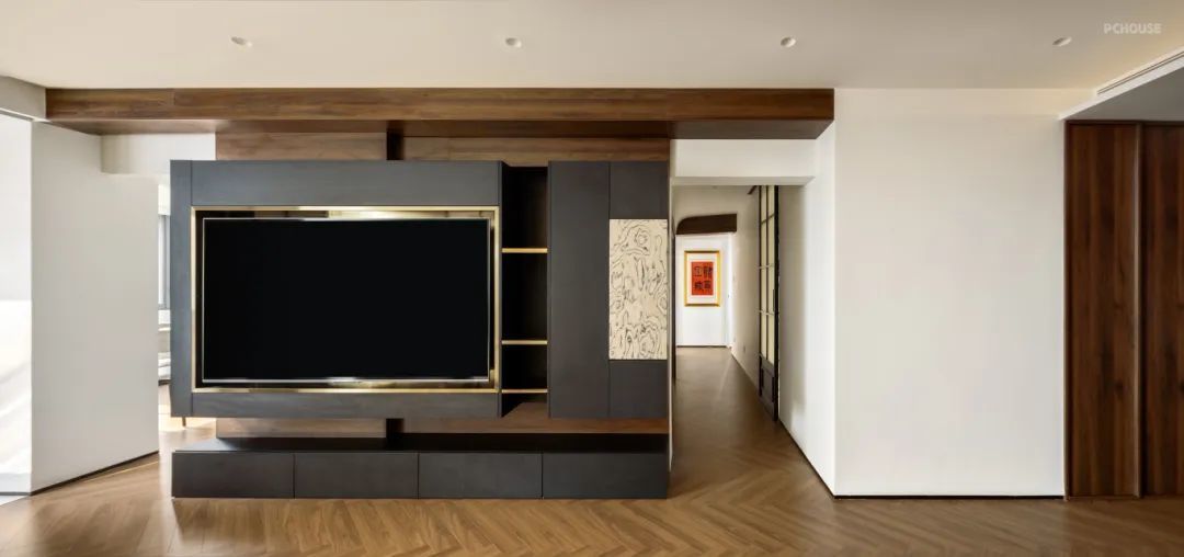 客厅的背景墙以白色柔和壁布铺陈过渡墙面,营造出纯净雅致的视觉体验。细窄线条采用爱格板精巧拼贴,与棕色地板相映成趣,和谐统一。电视背景墙则以金属包边勾勒,将管线收纳于柜中,打造现代高级感。