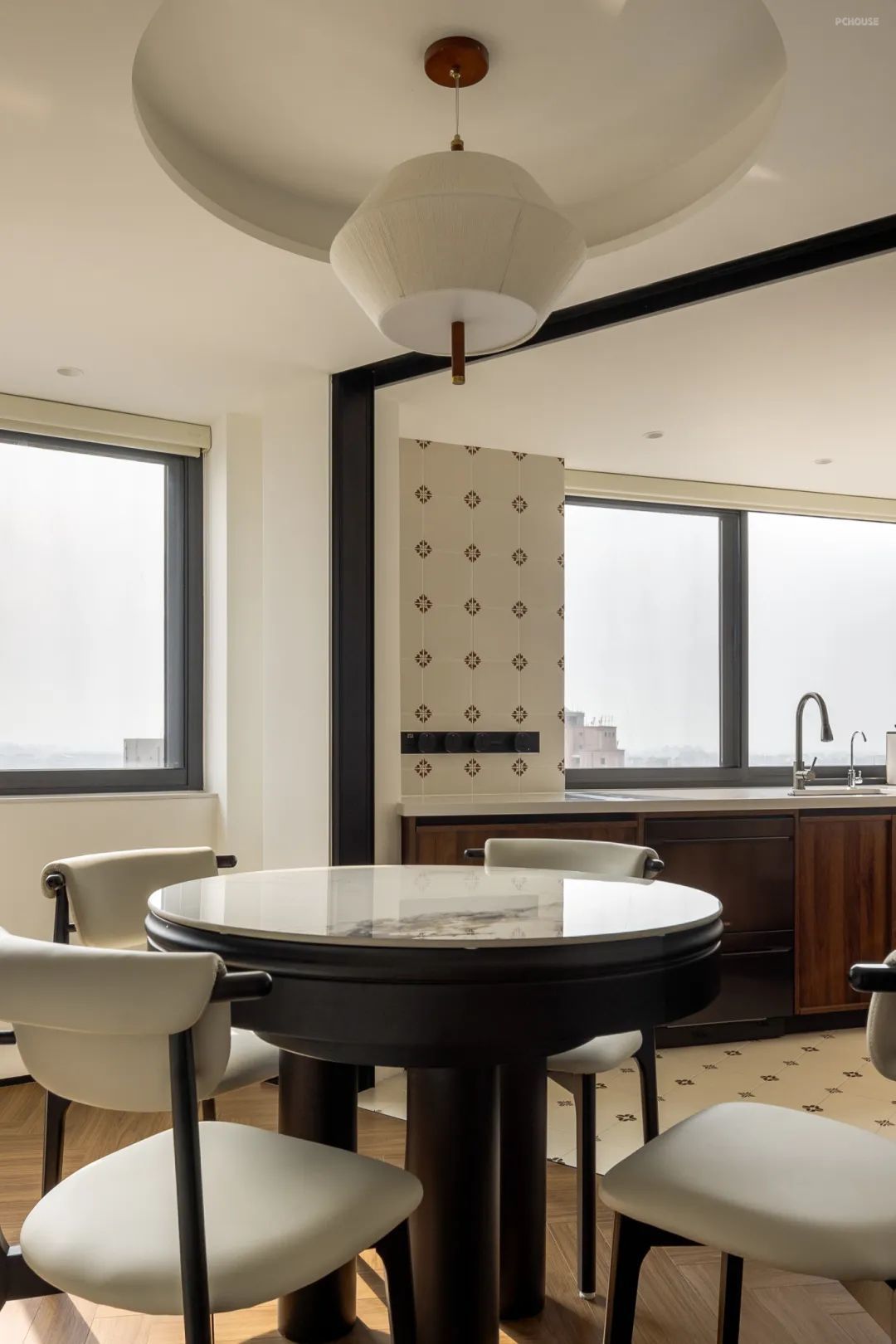 前言: 本案位于上海长宁,130㎡的旧房改造项目,独特的半个扇形布局为这次改造增添了无限趣味。常住人口是一家三口,需要一间长辈房。女主人是钢琴老师,喜欢复古的感觉,设计师将整体设计风格定位于中古风,打造出一个既典雅又充满艺术气息的居住空间。