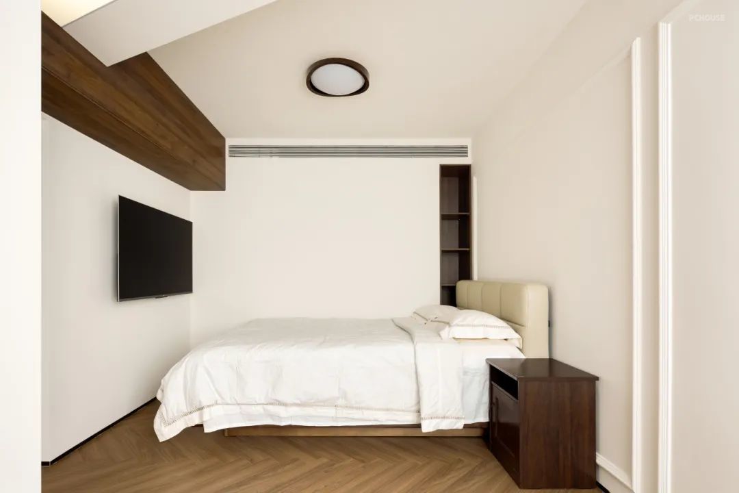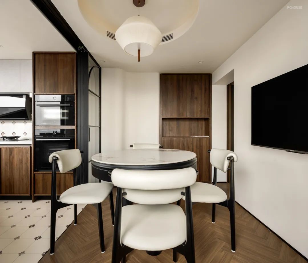 1.半扇形的原始布局给改造带来了挑战,我们拆除部分墙体,空间重组,将整体风格定位为中古风,将原本的两室格局转换为三室空间。2.规划餐厨区域,增加厨房空间的使用面积及收纳空间,为家庭烹饪和日常料理提供了更加宽的环境。 3.客厅规划西厨兼水吧区,定制的旋转餐桌成为亮点。可以根据需求隐藏起来,节省空间,还能轻松旋转,适应不同的使用场景。4.女主人是一位钢琴老师,有摆放两架钢琴的需求。一架钢琴优雅地坐落在客厅;另一架则放置在卧室,为她的私人练习和创作提供理想空间。
