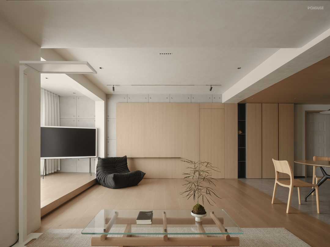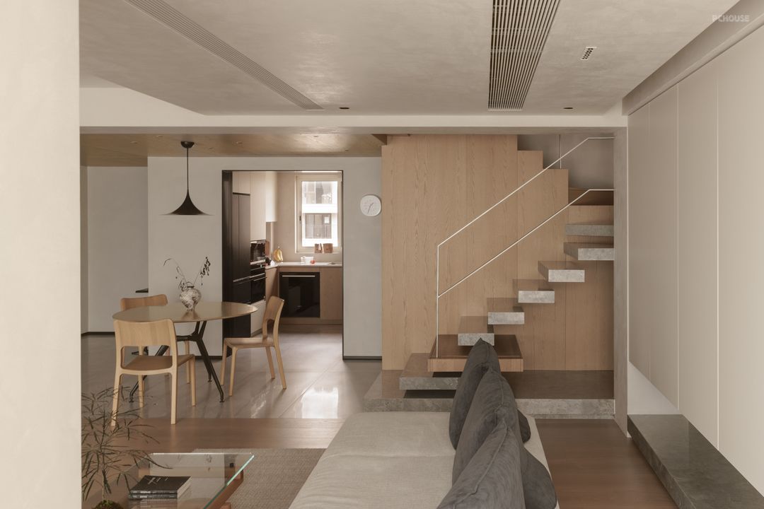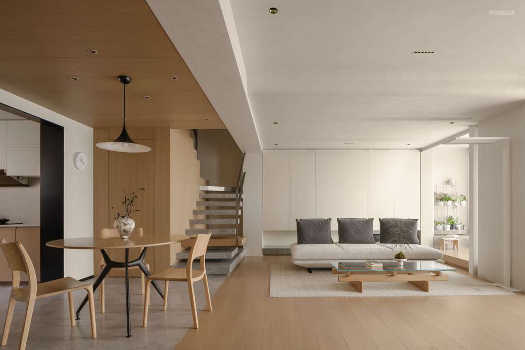The entrance is the prologue of the home. As soon as you enter the room, the spacious layout of the integration of the living room and dining room will come into view, and the transparent vision will relax your body and mind in an instant. Through just the right amount of white space, the sense of boundary is dissolved, and people interact more closely with the space. The collision of materials and the blending of colors disperse the temperature of the home between baths, creating a quiet and warm habitat.