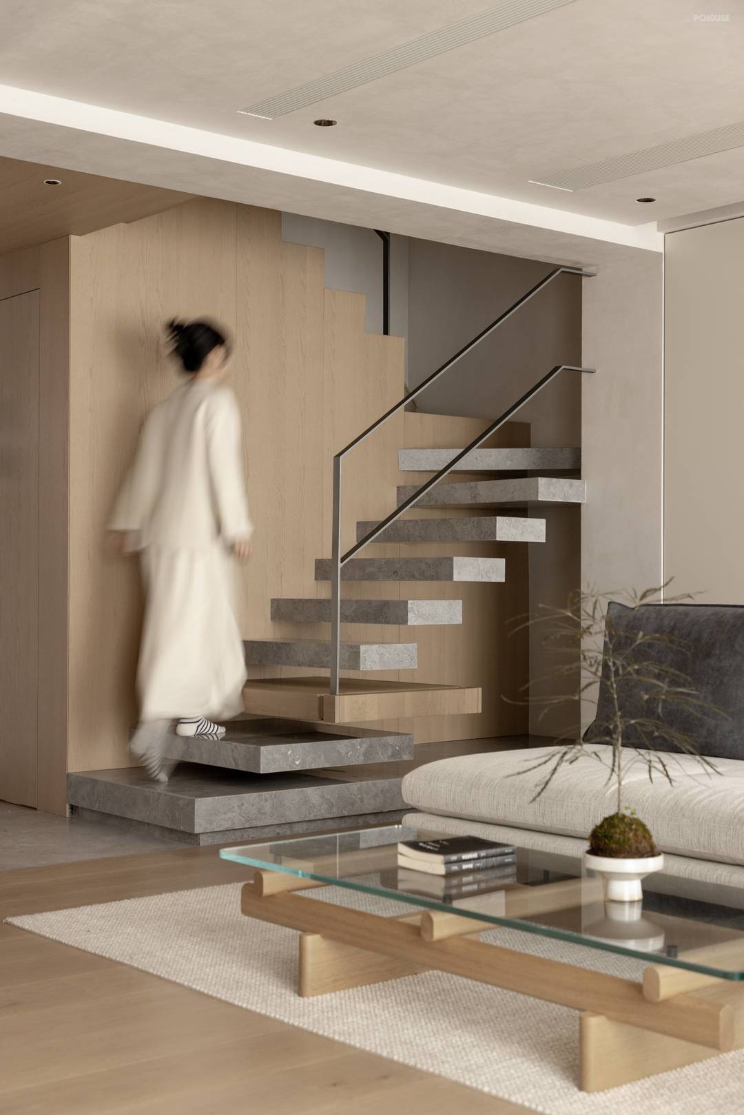 The suspended staircase connecting the upper and lower floors, like a sculpture, stands still in the space. Each step is a separate block, embedded in the wall, and supported by a concealed steel structure, floating in the air, presenting a sense of transparency. The delicate metal armrests, which outline the layers like lines, interpret power in minimalism and build a visual balance between the virtual and the real.