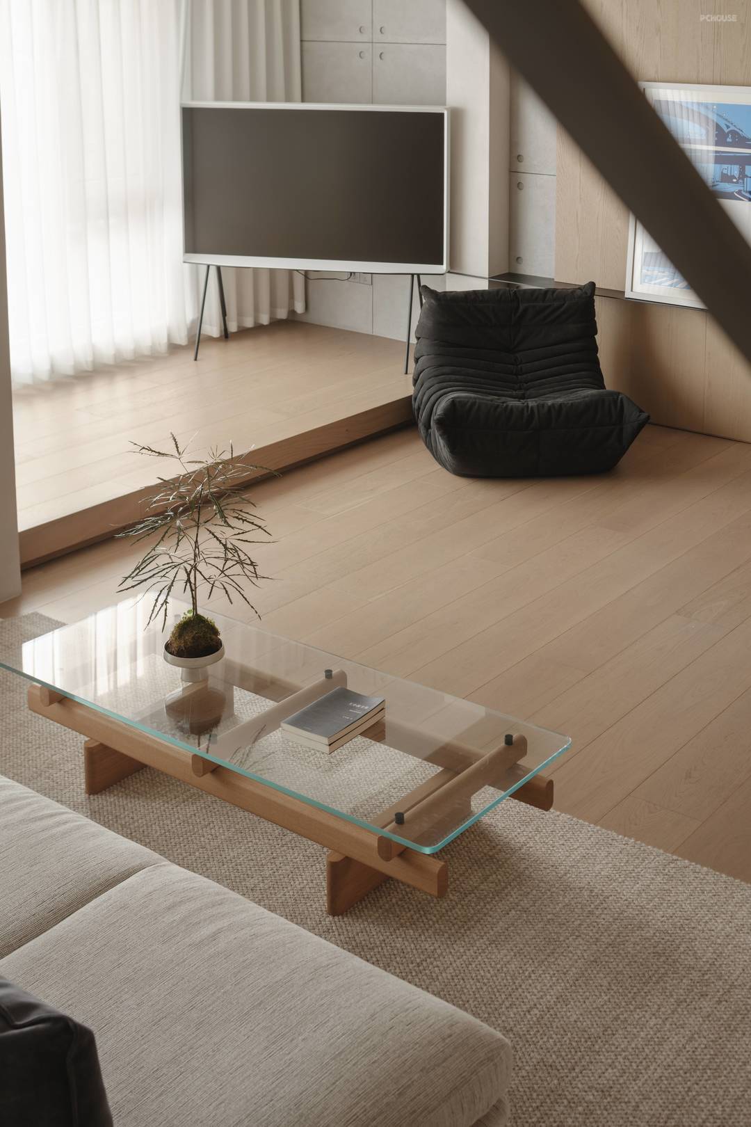 The balcony is incorporated into the living room and raised by a platform to create a place of relaxation. Light poured in through the window and spilled on the wooden floor, soft and warm. The harmonious symbiosis of wood, stone and metal not only defines the boundaries of the field, but also shapes the visual hierarchy of minimalism without losing rhythm.