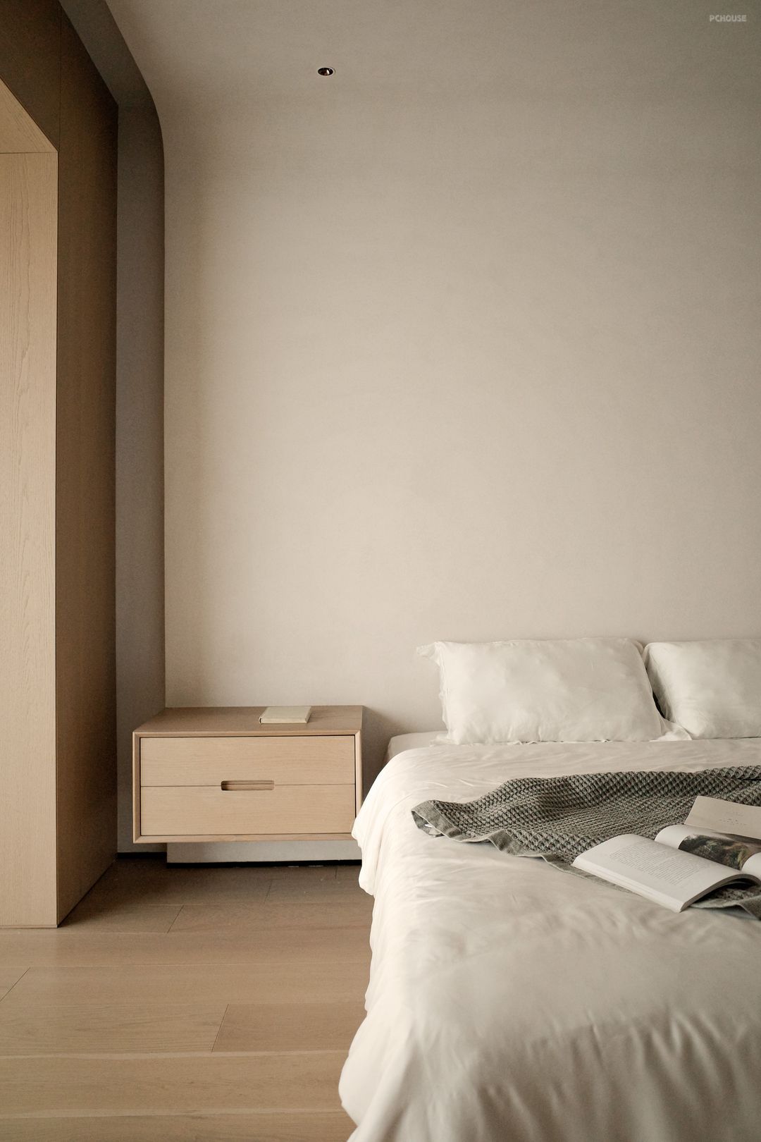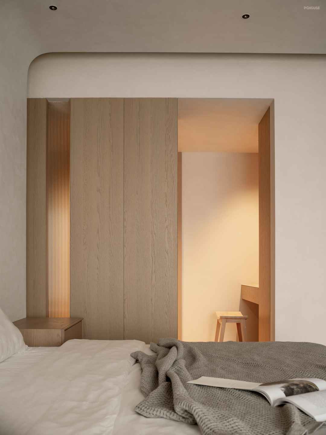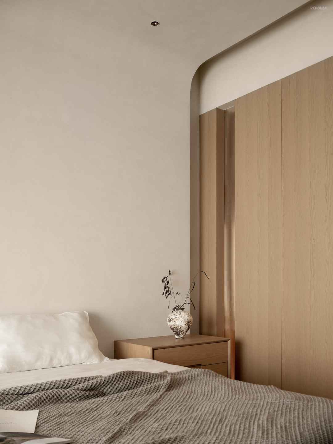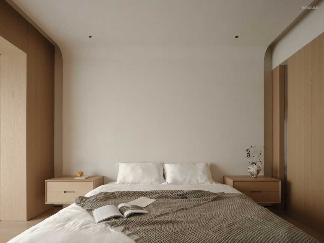 The combination of wood and white creates a warm and quiet resting atmosphere. The curves outline the curvature of the wall, wrapping up a soft visual experience, as if it is a quiet and gentle haven.