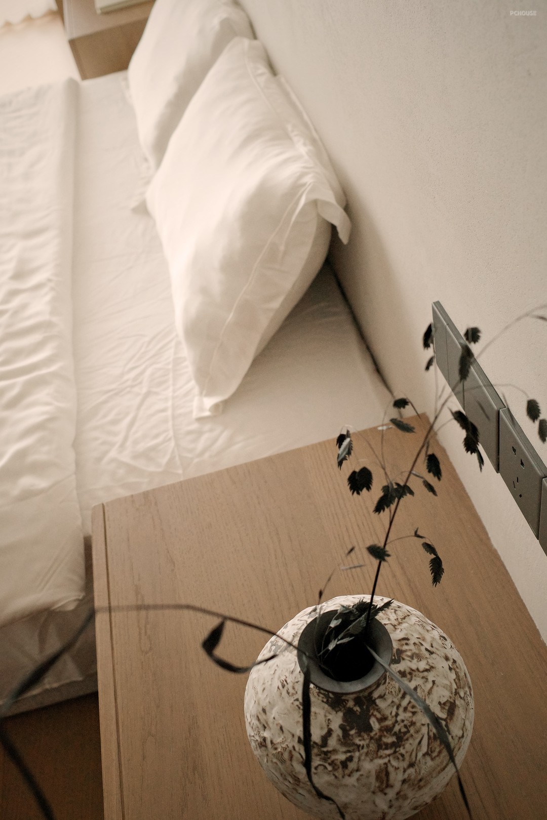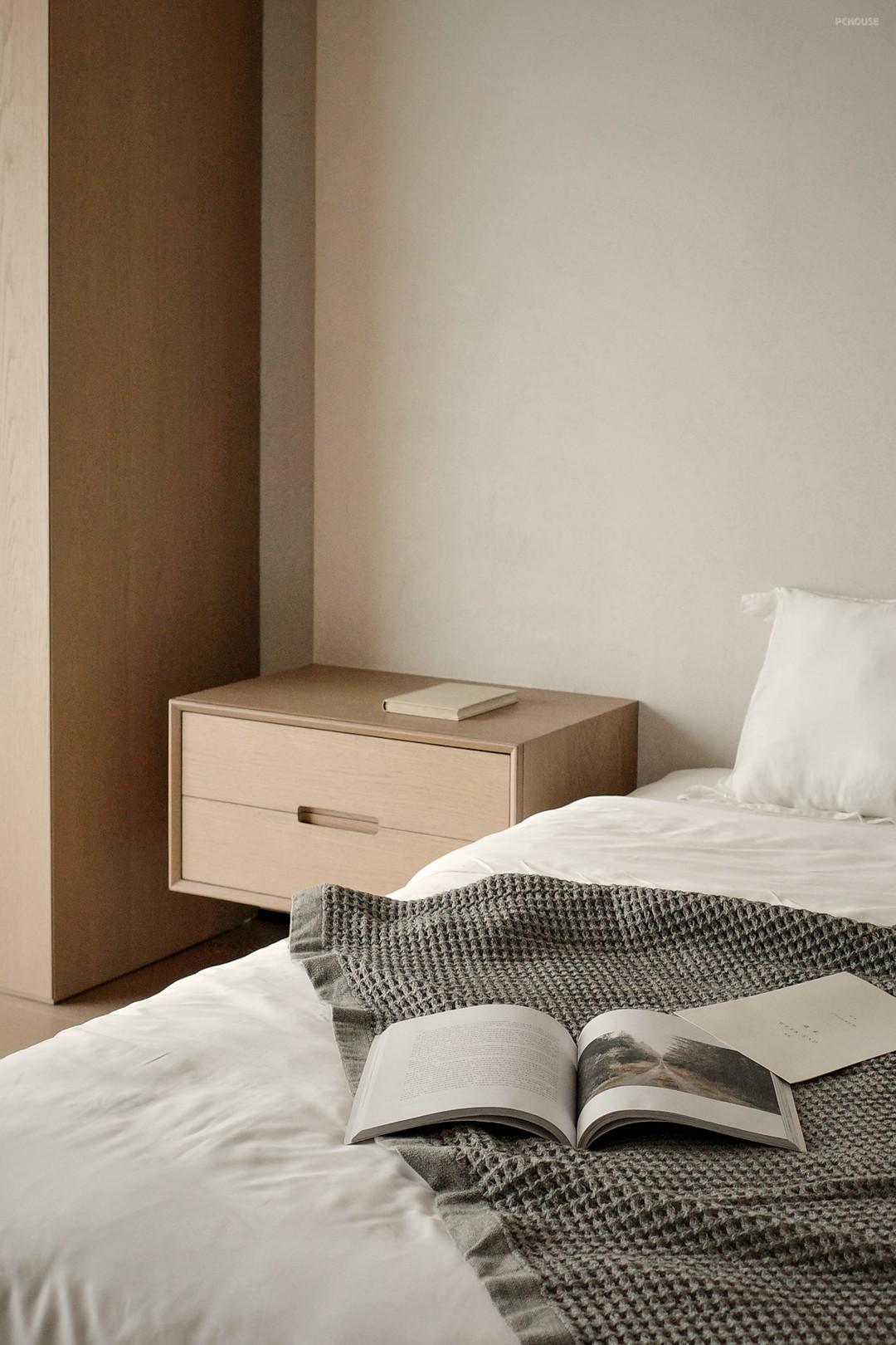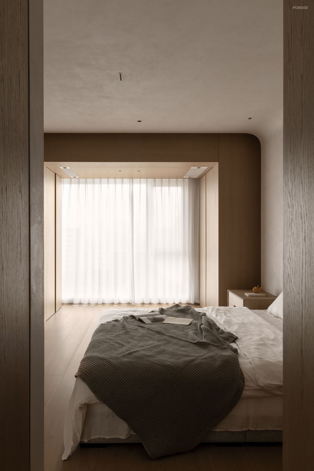 The combination of wood and white creates a warm and quiet resting atmosphere. The curves outline the curvature of the wall, wrapping up a soft visual experience, as if it is a quiet and gentle haven.
