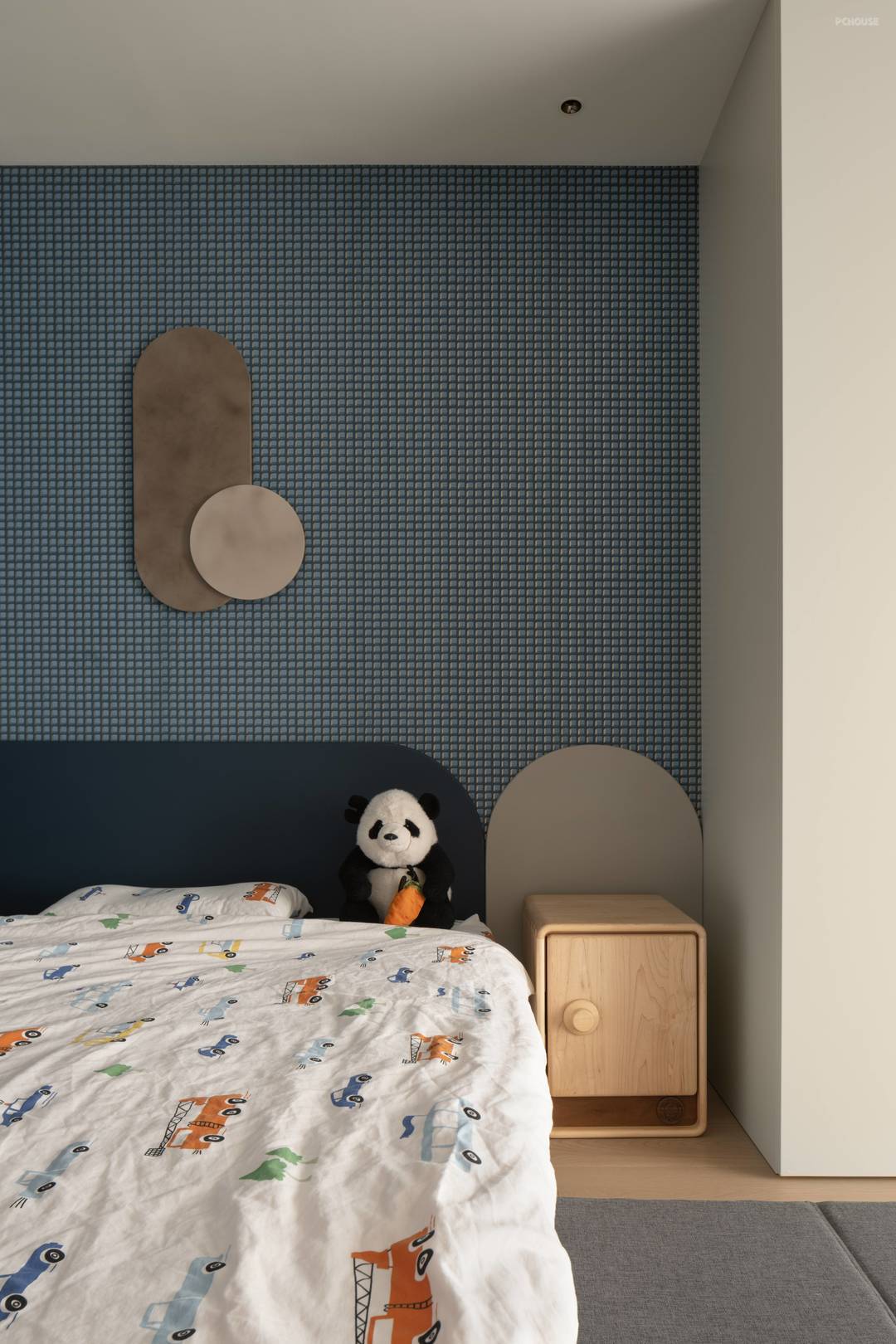 Space is the stage for growth. The background wall of the bedside is tiled with blue checkered patches, with a delicate and rhythmic texture, and a curved headboard design, showing safety protection in the softness. The bed is set against the wall and immersed in the tranquil blues, providing a sense of peace of mind and a spacious activity area for children to play, explore and grow. The blend of materials and tones dilutes the boundaries of the shape and makes the whole more fluid.