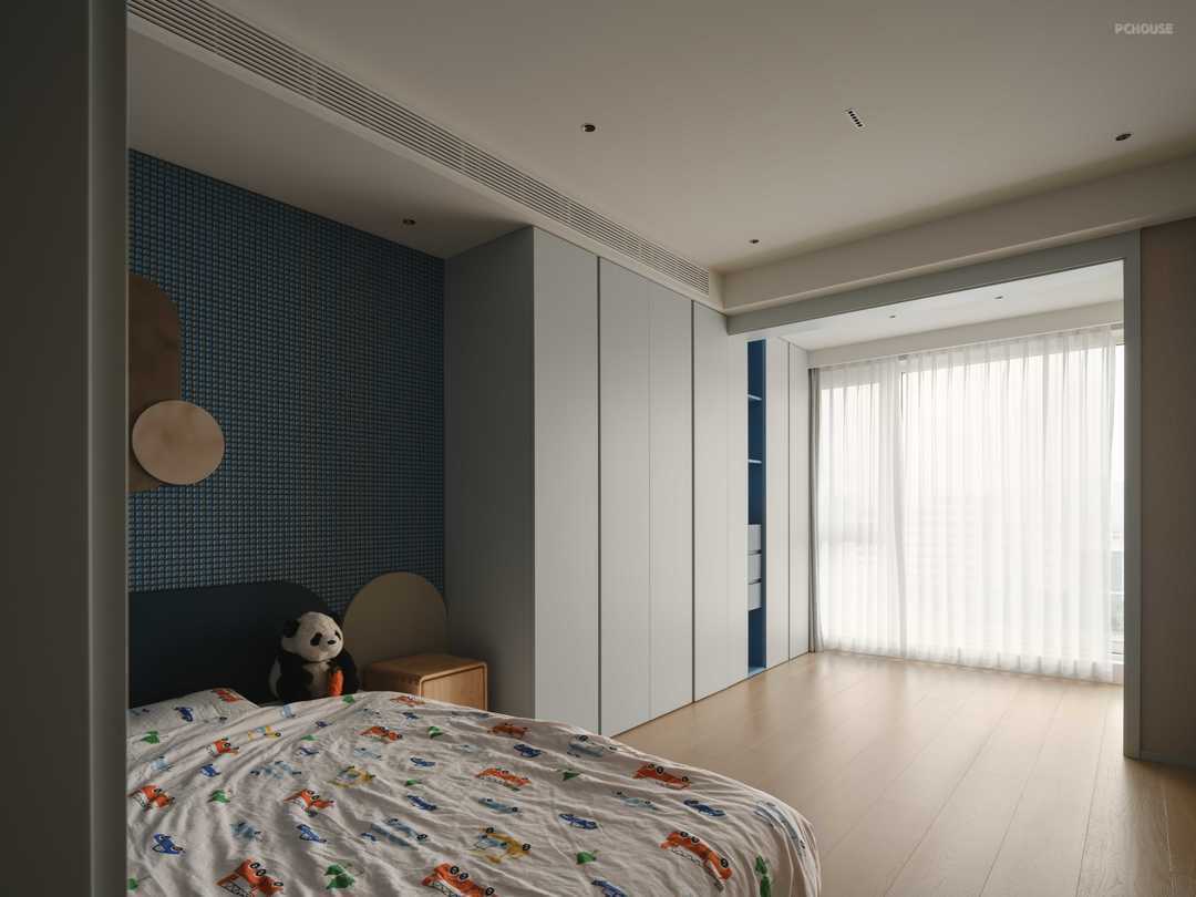 空间,是成长的舞台。床头背景墙以蓝色方格拼贴,肌理细腻而富有节奏感,搭配弧形床头设计,柔和之中尽显安全守护。床榻依墙而设,沉浸于静谧的蓝调之中,既带来安心感,又腾出宽敞的活动区域,让孩子自在玩耍、探索成长。材质与色调的交融,淡化了造型的界限,让整体更具流动性。