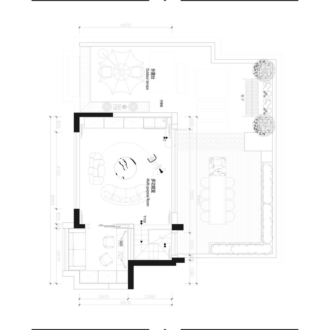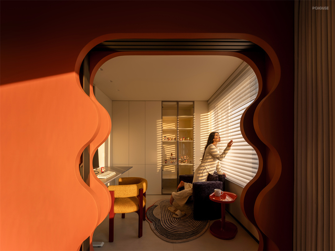 女屋主的书房,门采用口袋门设计,可开可合,灵活多变。当升降投影幕降下,书房瞬间变身小影音室,为小两口打造私密的视听世界。柜体以结构主义形式呈现,开合、平拉等不同开启方式,满足多样收纳需求。直饮水、洗衣机烘干机、壁挂洗衣机等家政功能巧妙植入其中,让生活便捷有序。走出房间,便是二层户外花园,这里将东北的围炉煮茶与烧烤文化发挥到极致。夏日傍晚,约上三五好友,围坐炉边,煮一壶香茗,品尝滋滋冒油的烧烤,享受悠闲下午茶时光,微风轻拂,满是惬意,成为家中最具烟火气与浪漫氛围的角落。