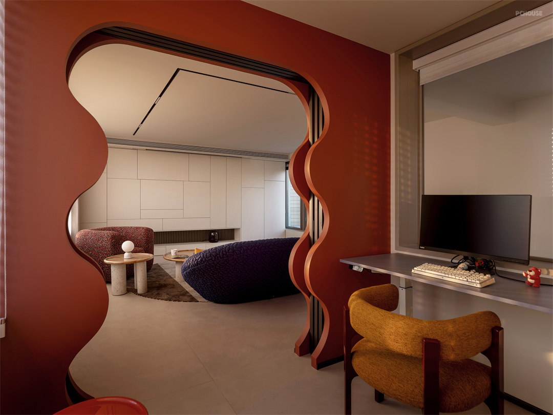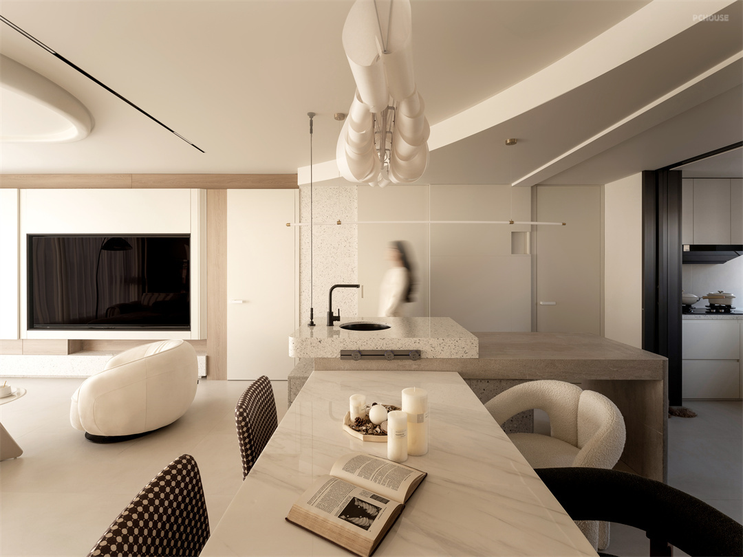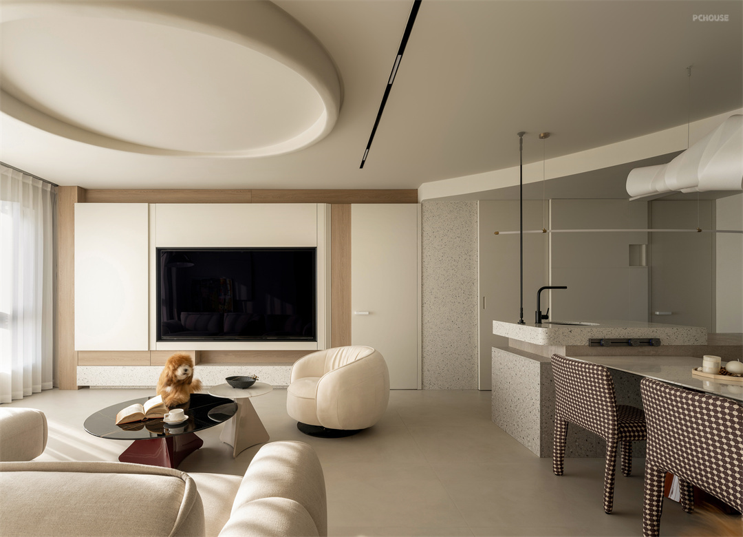 客厅空间是整个家的核心区域,我们采用 GRG 定制造型打造棚顶,独特的造型宛如天空中流动的云朵,轻盈而富有艺术感。电视墙与柜体相连,搭配外开门,以解构主义手法将电视墙、客卫门与客卧门巧妙融合,形成一个有机整体。每一处线条、每一个转角,都经过精心雕琢,看似随意却又和谐统一。在这里,沙发、茶几摆放错落有致,人们围坐于此,无论是观影、聊天,都被浓厚的艺术氛围环绕,客厅成为展示解构艺术的华丽舞台,承载着家人的欢声笑语与温馨时光。