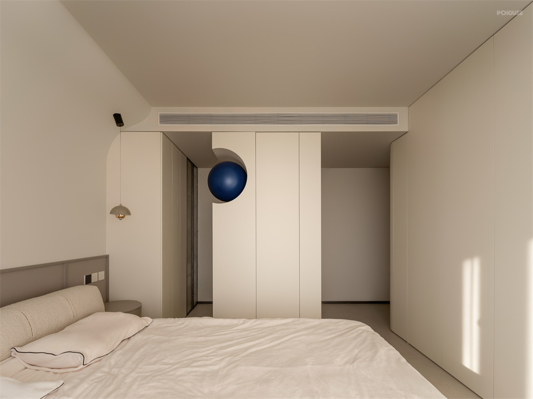 一组小衣柜搭配蓝色的建筑球体,巧妙地将卫生间门做了遮挡。光线通过建筑球体与间隙进入过廊,卧室过廊和卫生间的动线设计成环形动线,
