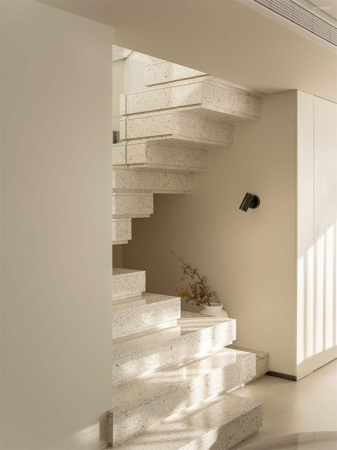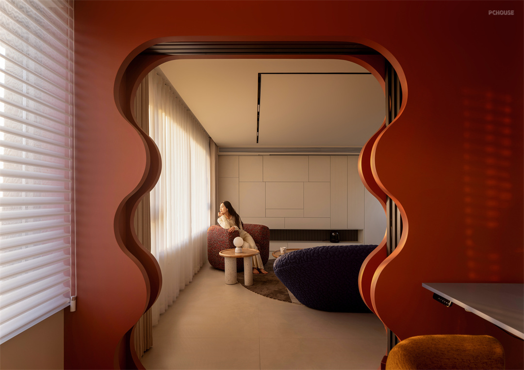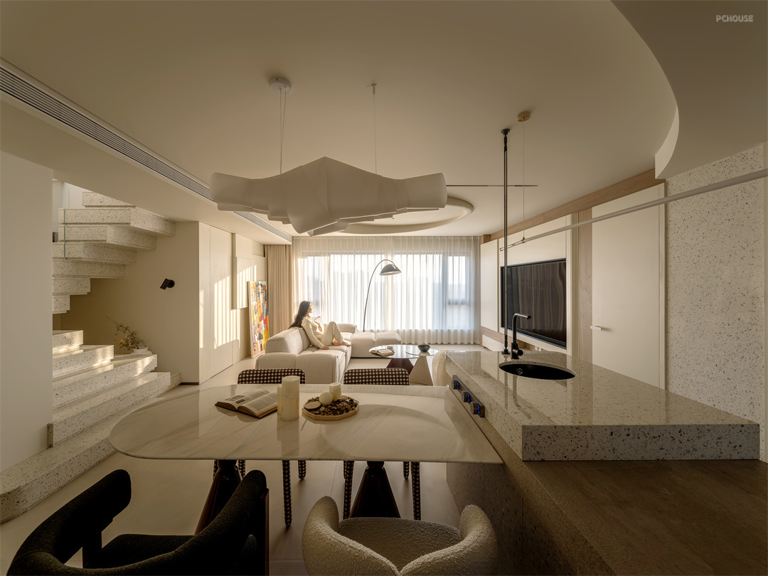 踏入家门,首先映入眼帘的是玄关区域,这里宛如一个神秘的过渡空间。我们选用新型材料墙体,巧妙划分空间,宛如魔法师挥出的魔杖,界定出家的起始边界。左侧收纳柜以卡洛斯・卡帕解构主义形式,顺着楼梯结构蜿蜒而上,像是自然生长而成。它不仅是收纳的容器,更将建筑形态的美感与自然光引入,每一寸木纹都在光影中诉说着独特故事。入户右侧,隐藏的衣柜与鞋帽间门,在解构主义手法下融为一体,线条流畅自然,让人的视线毫无阻碍地穿梭,空间仿若被无形的丝线串联,灵动而和谐,开启了家的温馨序曲。