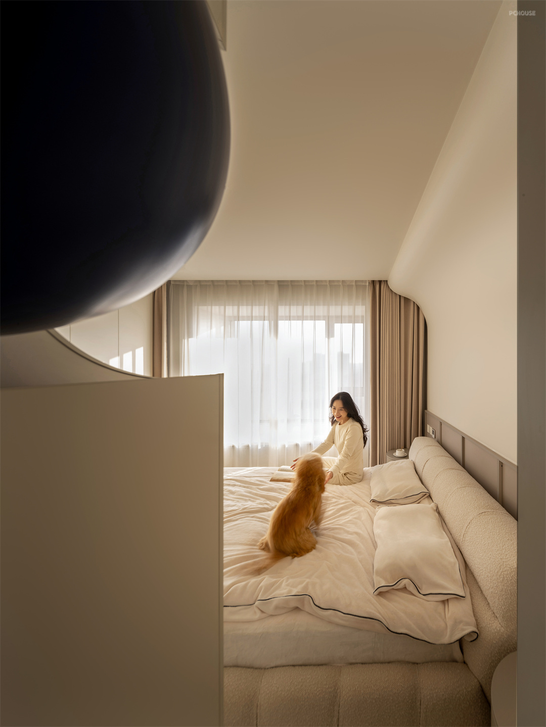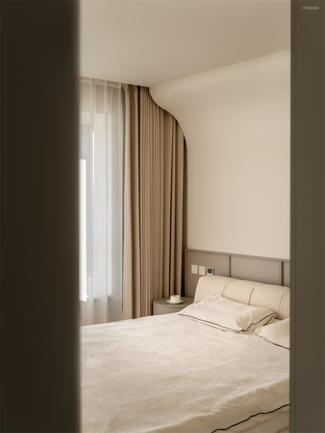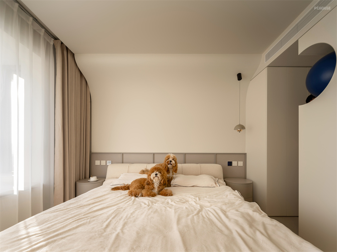 二楼是屋主二人的专属休闲空间。奶白色的柜子与墙体保持同色,让主卧空间更加宽敞明亮。